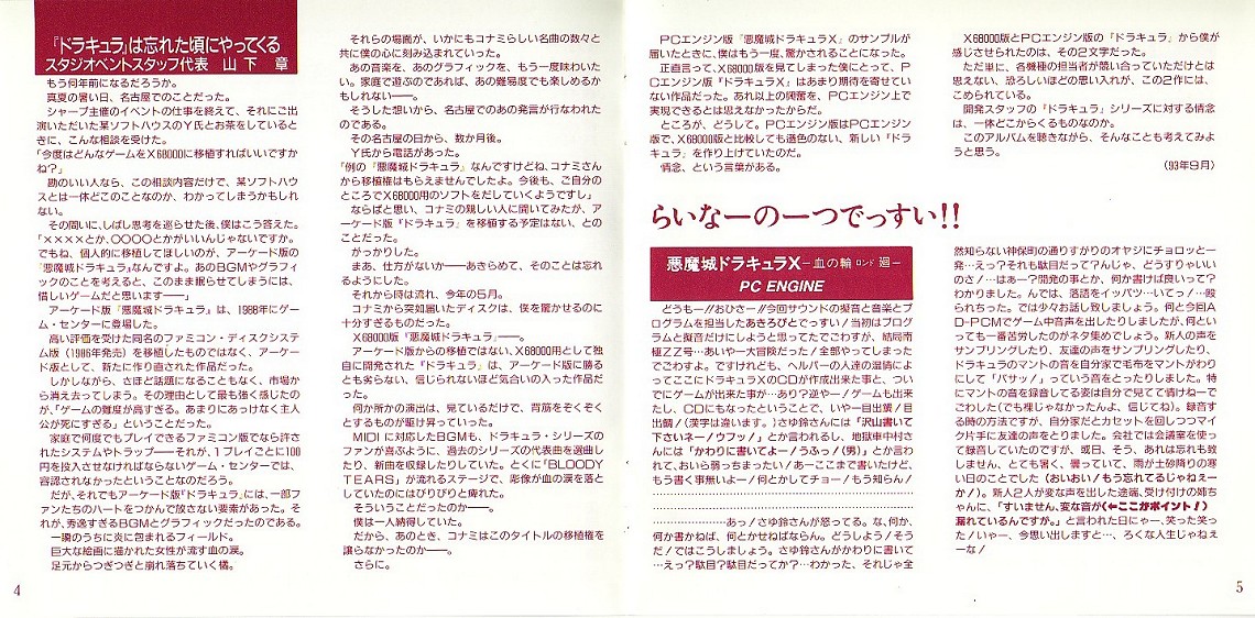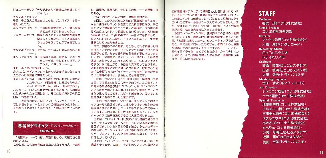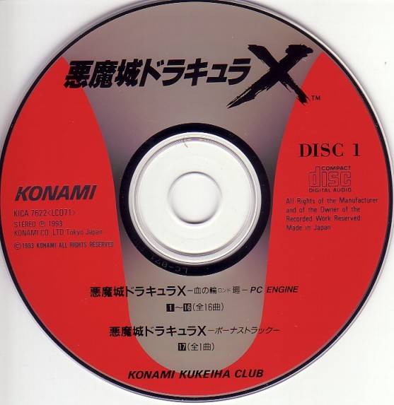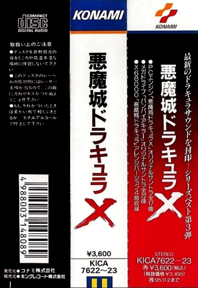 This collection, a two-disk set, from 1993 features works from Akumajou Dracula X: Chi no Rondo, Akumajou Dracula X68000 and Vampire Killer (what the west knows as Bloodlines). Scans include the casing, the booklet and the two CDs.