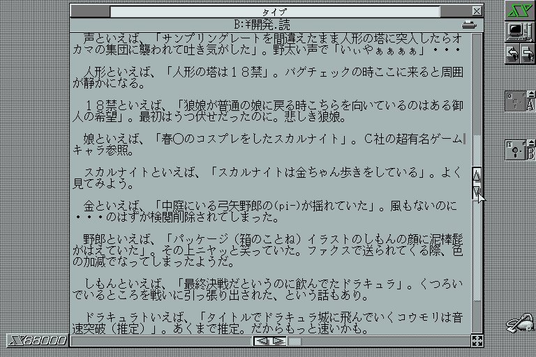 Apparently, Akumajou Dracula X68000 came with its own desktop themes found hidden somewhere on the game's disk. The sender, Carl, makes these comments: "These pictures show that there's a hidden omake ('a special bonus') that would consist of some pictures of enemy designs--omake1.PIC and omake2.PIC."