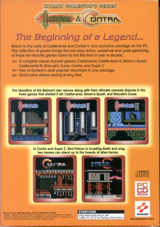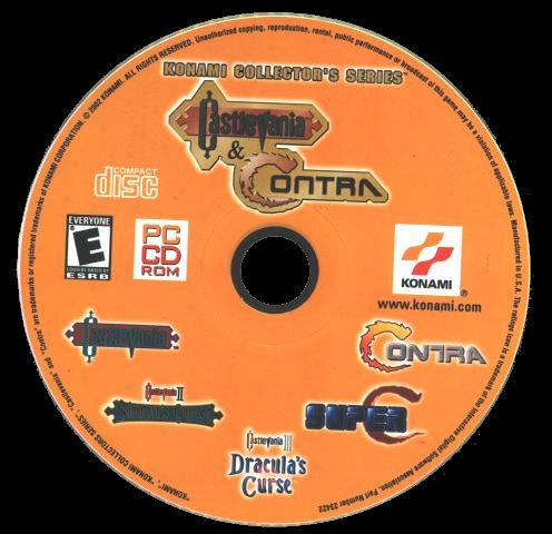 Castlevania and Contra: Konami Collector's Series, released in 2002 for the PC, is a collection of five Konami hits from the days of the Nintendo Entertainment System: Castlevania, Castlevania II: Simon's Quest, Castlevania III: Dracula's Curse, Contra and Super Contra. Additionally, the CD contains a Dance Dance Revolution demo. This package was during October of 2006 (and Halloween specifically) re-released for the download service GameTap, which under its multi-system service made available the individual titles mentioned above.
