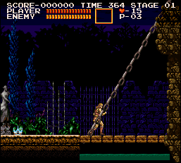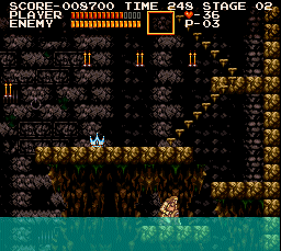 | The second secret is also on the first stage--they call each section a "stage," so ignore the corner-right text in the image. At the end of the fishmen area, a platform rests hidden just below the water. To get to it, strike the last brick of the platform above Simon in the image to open up a way down. Duck near the middle of this bottom-most platform to make the treasure pop up. | ![]() |