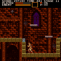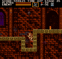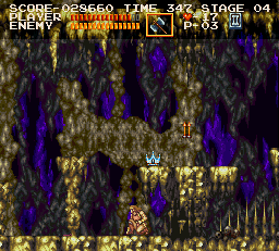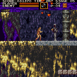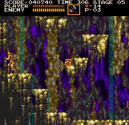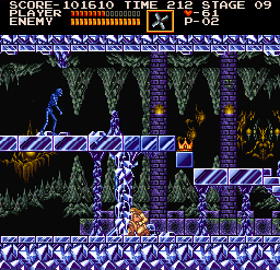 | On stage two, drop down from the beginning and fight past bats and other obstacles until you come to an area where three stalagmites fall in succession, providing a platform upward. To the right of the third one, duck right around where Simon is in the image. A treasure in the form of a crown should pop up right above you. | ![]() |