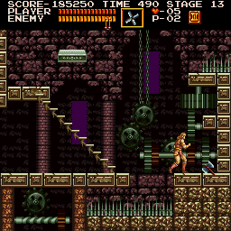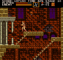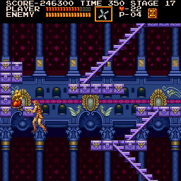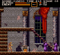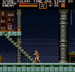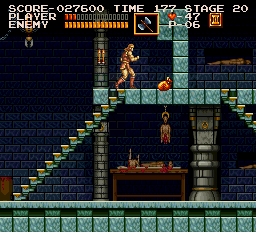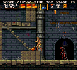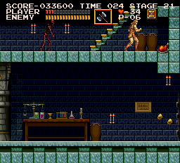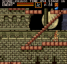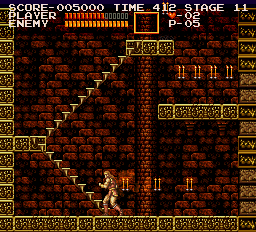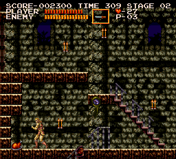 | On stage six, the dungeon, you'll encounter the Frankenstein monster on one of its highest levels. After dealing with it in your preferred method, make your way to the stairway depicted right. Stand where Simon is placed and jump straight up; when you land, a Moai Head will pop up on the platform at stair's top. (Contributed by Morgoth.) | ![]() |