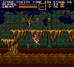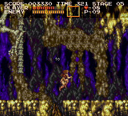 Taunting Technical: In the second half of the game's second stage, the Underground Mine, you'll come to an area where wyrms break through the ground to strike at the surprised Simon. You can destroy them before they get chance or you can take advantage of the situation by repeatedly jumping over the wyrm-filled chasms. Each time you complete a jump under this circumstance, you'll receive ten points, which will be made visible. (Contributed by Kevin.)