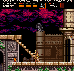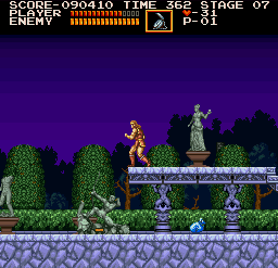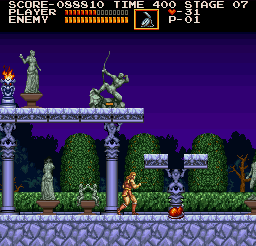 | On the third stage, you'll pass by a fountain and soon be assaulted by statues that arc deadly arrows in your direction. Find the platform illustrated in the screenshot and simply walk to its edge, where Simon is standing. Directly below the platform, at ground level, a money bag will pop up. (Contributed by Morgoth.) | ![]() |