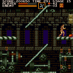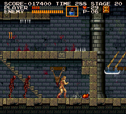 | On stage four, climb to the top of the very first vertical room, enduring skeledragons and Medusa heads, and place yourself on the room's topmost platform. Walk left and fall right off of it and you'll hear the emergence of the hidden treasure--in this case a Maoi Head--which pops up off screen; simply climb or drop down to collect it. (Contributed by Morgoth.) | ![]() |