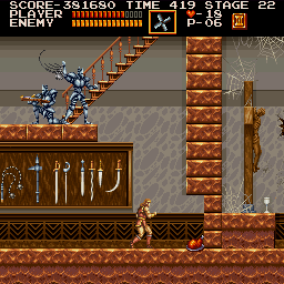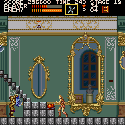 At the start of the final stage, different knight types will try to impede your progress. Breach through and make your way to the end of this first horizontal room. Stand for five seconds where Simon is positioned in the screenshot and another rare 1-up symbol will pop up just ahead. (Contributed by Morgoth.) |