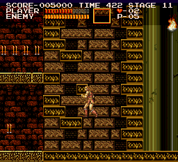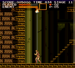 At the start of stage six is a vertical room that's all straight down. Before leaving this area, emulate Simon's positioning in the picture and stand there for five seconds; a money bag will pop up on the platform high above. Quickly climb the stairs to collect it. (Contributed by Morgoth.) |