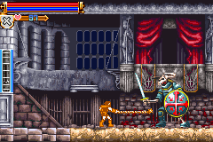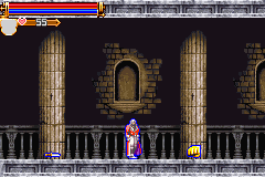 Remember that Maxim, like Richter in Symphony, wasn't made with this this level design in mind, so he'll have to rely on his special moves to travel about and explore at will. That is, Maxim can travel just about anywhere he wants to go from game's start, including both castles, without restriction. However, he has some restrictions in other areas of play: (1) He can't access an inventory screen, which means that he can't collect armor or furniture, find a merchant, or anything else associated with it. In their place will be found single hearts. (2) Life vials do raise his HP cap, but his stats will always be lower than that of Juste's at a high level; too, heart containers will simply add five hearts to his total. (3) He can't collect any of the sub-weapons, since he comes equipped with his own. (4) He can't attain 200% castle-completion due to the inability use the switch that opens the barrier blocking the heart of Castle A. (5) Since he can't collect Dracula's remains, he must instead defeat all of the game's bosses to access the heart of Castle B. (6) Due to his status as a secret character, there are no story elements to be found for his mission; he does, however, have his own ending sequence.