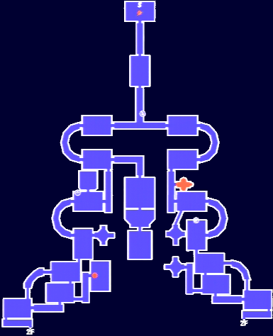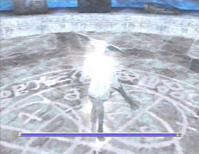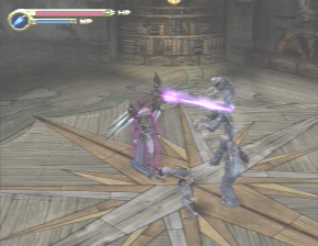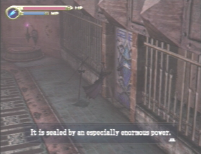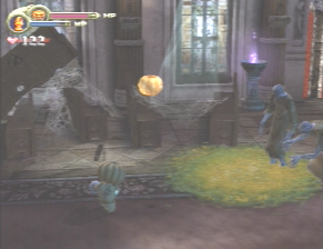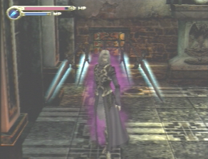 Joachim's mission is less restrictive than Leon's; he, too, must defeat the five guardians to break the seal to the upper half of the castle, but he can move freely through those five initial areas--not needing keys and such--and make jumps that Leon could not. However, he has some restrictions and other general differences: (1) He can't access an inventory screen, which means that he can't collect items, weapons, orbs or armor, and Rinaldo won't be at the shop to sell him anything. Such items simply won't be there, replaced by meter-ups or minor items like potions and mana prisms. When he touches an item, it'll take effect automatically. (2) He can't gain fighting abilities or maintain stats, his HP and MP meters are shorter, and his defense and attack powers are low; to cure this, he'll have to collect the HP-, MP- and defense-ups that replace the normal items. Also, he can collect exclusive attack-ups, most of which are found by defeating secret bosses. (3) Since he has no whip-latching ability, there are large glowing cubes placed in trouble areas to help him reach certain places. (4) Since he can't collect special sequence-initiating items, the Golem and Succubus battles will begin as soon as he enters their domains. Also, he'll unlock the door in the Eternal Prison simply by hitting a switch. (5) There are no story elements to his mission. (6) He receives his own ending, however abbreviated, for defeating Walter and Death.