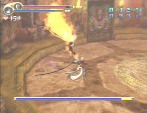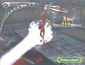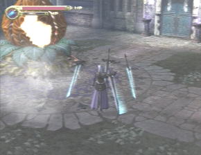 Joachim is unique when compared to many of the series' characters. He's a bit slower than Leon, but he's a better horizontal and vertical leaper, both with his regular and double jumps. He's a better long-range fighter and can effectively keep his distance. Since he has no stat-potential, he must of course increase his abilities by finding the meter-ups that'll increase his attack, defense and the length of his meters. While he'll eventually be stronger than Leon, his lack of inventory will render him more beatable. Joachim is always surrounded by five symbiotic swords, and he can arrange them for two separate sword attacks: (1) Sword Chuck, where he can throw them one after another. If he throws all five before any of the others have returned, he'll be limited momentarily. (2) Circle Slash, a weaker and shorter-distance attack where he can endlessly swipe the swords, one after another. The initial shot of both attacks can be charged up, too. He has these and other moves: