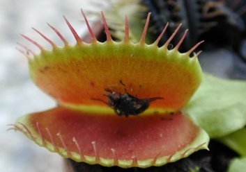 | Description: | "The Venus Fly Trap (dionaea muscipula) is probably the most well-known carnivorous plant. It's an endangered species in its natural habitat, a small area of bogland spanning North and South Carolina. Fortunately, it should remain a long time in cultivation because of high demand. On the inside of each lobe are three trigger hairs; the trap will close in around one-third of a second if an insect or an object disturbs those hairs. Once the trap is sprung, the hairs must be moved once more to close it; this is to prevent the trap fom dying by digesting an inert object blown forth by the wind. (See also Killer Plant.)" |