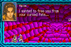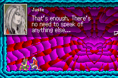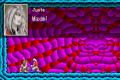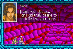 Juste finally finds his friend in the heart of the transient castle. Maxim has managed to fight off Dracula's total possession and keep Lydie safe until Juste's arrival. Unfortunately, he can no longer endure the possession and fears that he may be imminently reborn as Dracula. With that in mind, he begs that Juste finish him off so that these events can be avoided. They have the following conversation: