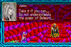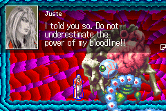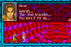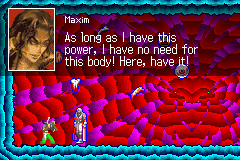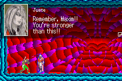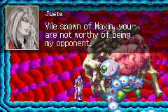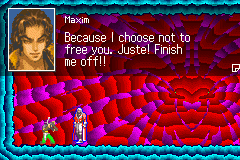 Juste finds Maxim in the heart of the castle, and it appears that his good friend has rescued Lydie. While he learns that it was previously true, he's shocked to find out that the Dracula-possessed Maxim has infected Lydie with the vampire curse by biting into her neck; he is also going to restore Dracula using the six collected body parts and watch as his new leader be reborn in his true form. With that in mind, he challenges Juste to a battle, knowing full well of the results: If he wins, it's another sacrifice to ensure a powerful rising; if he loses, Juste has to forever live with taking his friend's life. Eventually, Juste defeats his possessed friend, and the following conversation ensues: