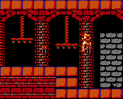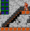 | Simon's main problem will show its face again and again as he works his way up and down staircases. In order to use a stairway, you must place yourself exactly within a two-block length of the first step and push upward; to climb down, you must place yourself on the block that the step rests directly over and push downward. There are two types of staircases when it comes to traveling downward: Those that are embedded into the middle of platforms/blocks, and those that are placed to the right or left of a block, forming a cliff. You must always remember to push downward in the latter case, since most deaths occur when players accidentally walk right off a cliff and plunge to their death. Fortunately, Simon will not be knocked off of staircases by enemy contact, as he'll simple freeze momentarily and sustain the proper amount of damage. | ![]() |