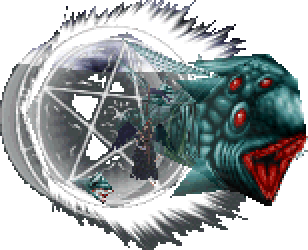 scythe attack; at any time, it can conjure large barracuda-like demons from a portal |