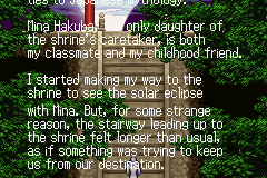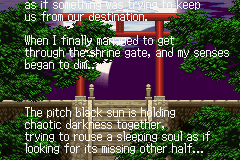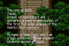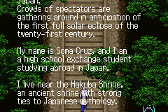 We open in Japan, a spectator to Soma Cruz' ascension up a shrine-gate stairway that takes him to a point high enough to view the century's first solar eclipse. The spectacle is not only awe-inspiring to Soma--it also brings forth an undesired effect on his senses.