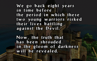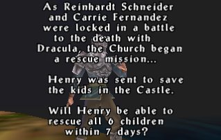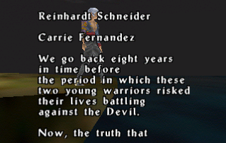 The intros of Reinhardt and Carrie remain unchanged from Castlevania 64, with the same set prologue before their own predicaments are noted within the final two paragraphs; Henry also uses that set prologue followed by his own mission sequence. Below is the set intro followed by Carrie, Reinhardt and Henry's. Keep in mind: At the latter part of each intro, the hero character is seen walking onto a mountain cliff, sizing up Castlevania. (For imagery for their intros, look here.)