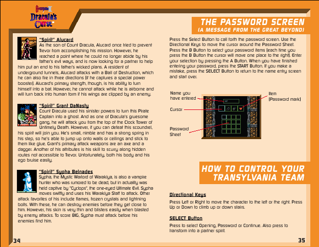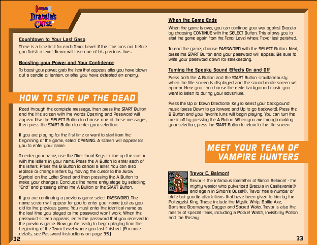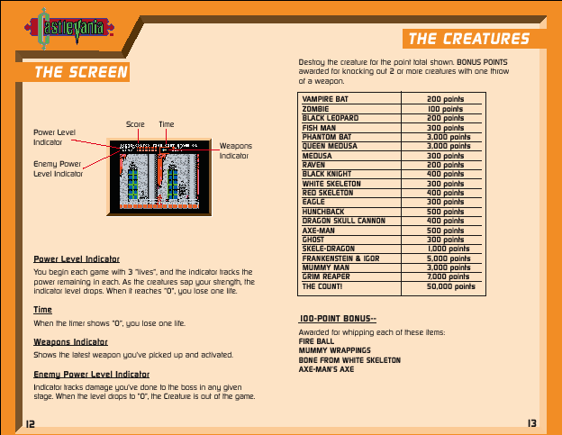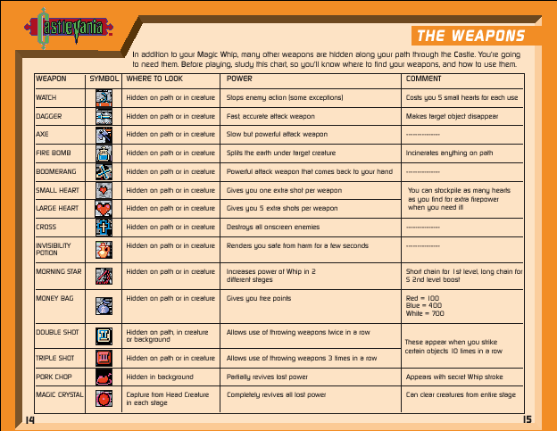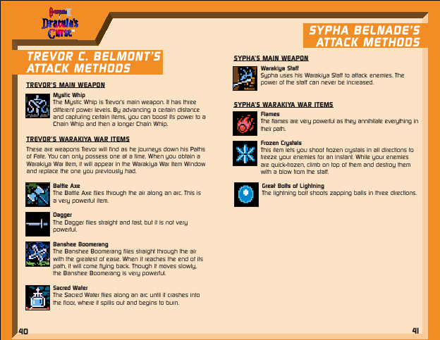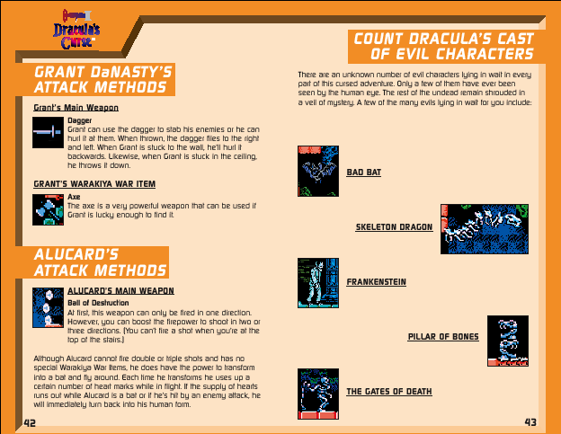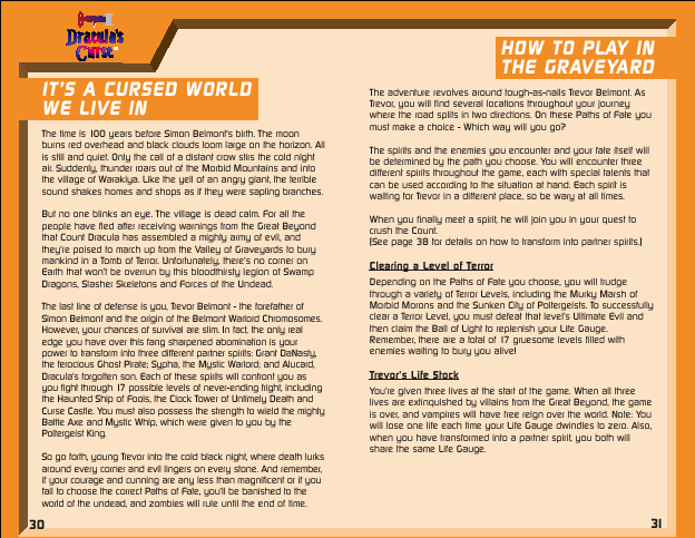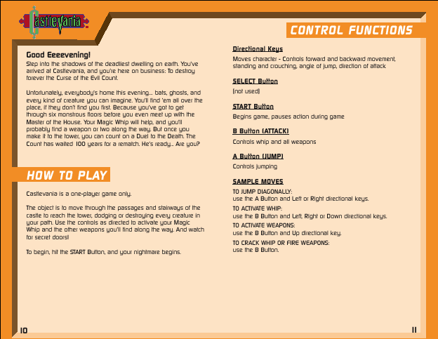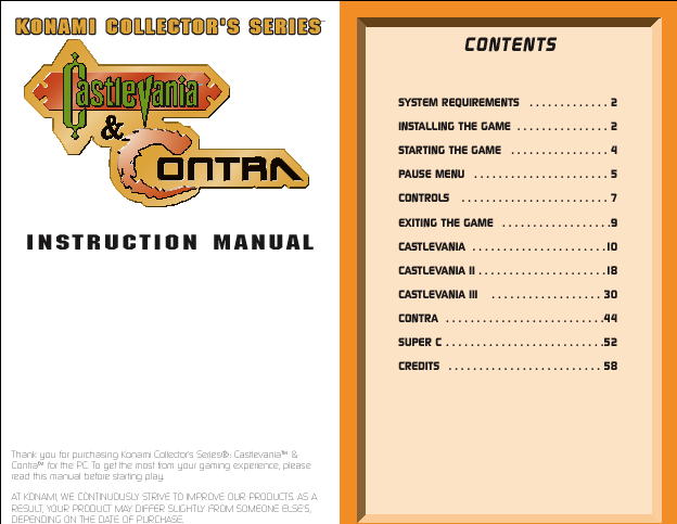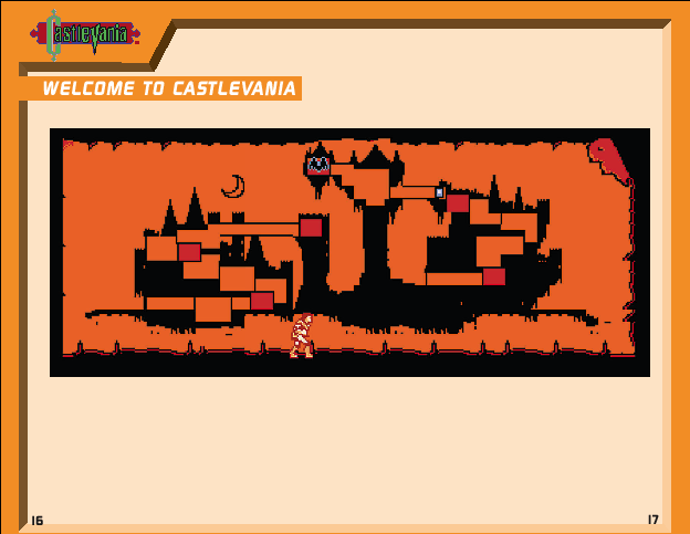 The packaging itself doesn't come with a set of instructions or a typical CD manual. Instead, all such information is on the CD itself and can be viewed using Adobe Photoshop. The manual is broken up into six parts: How To Play, Castlevania, Castlevania II: Simon's Quest, Castlevania III: Dracula's Curse, Contra and Super Contra. The pages are set up to mimic those of the actual games' manuals from back in the NES days, only with more image detail. I won't show the "How To Play" portion because it's just text, and I won't be covering the Contra series for obvious reasons.