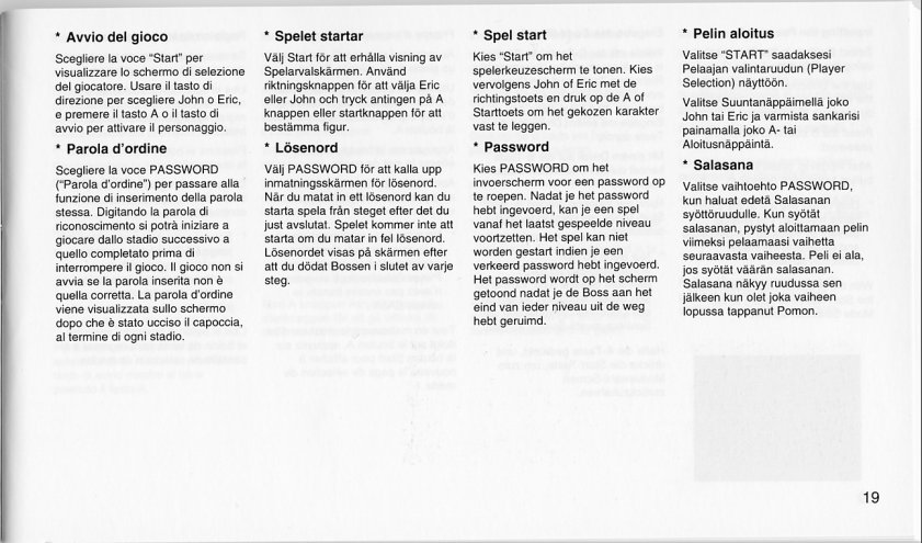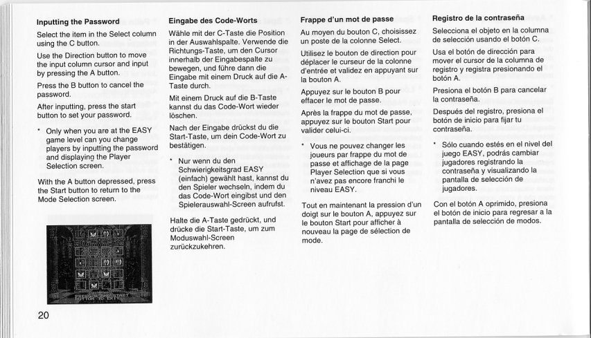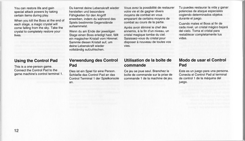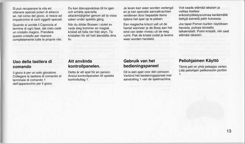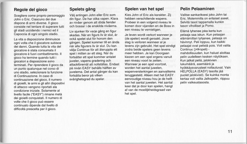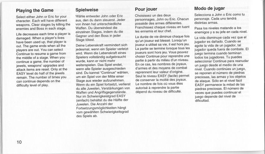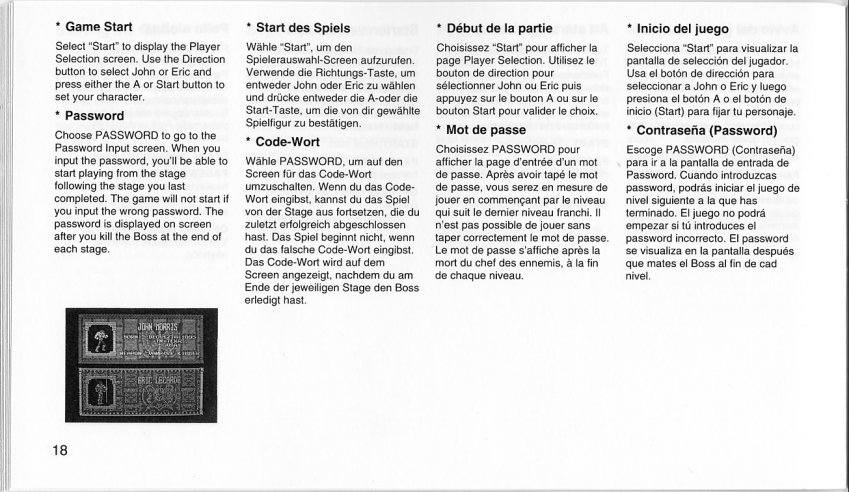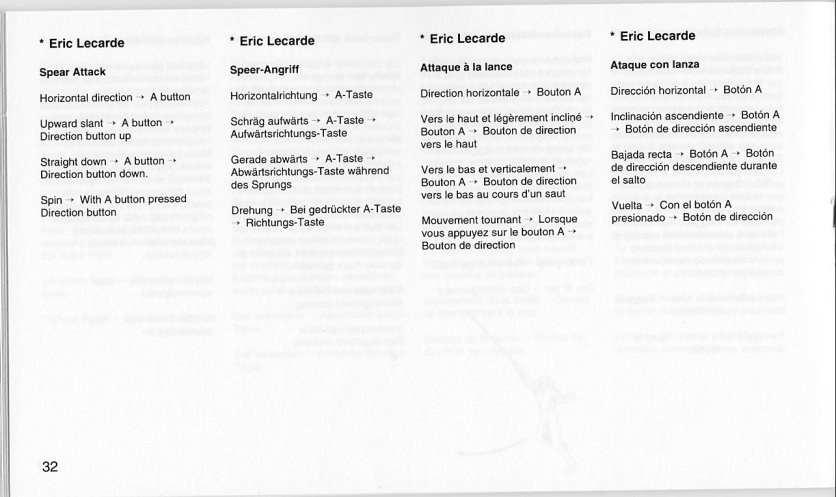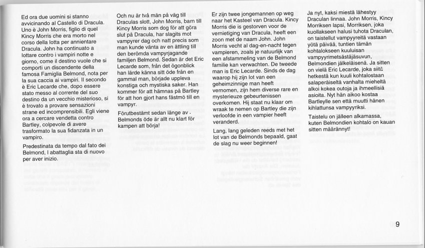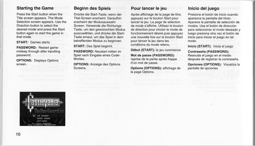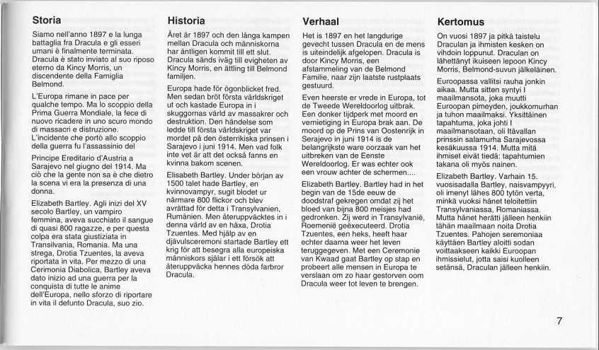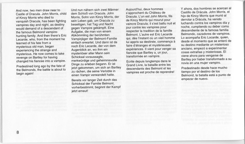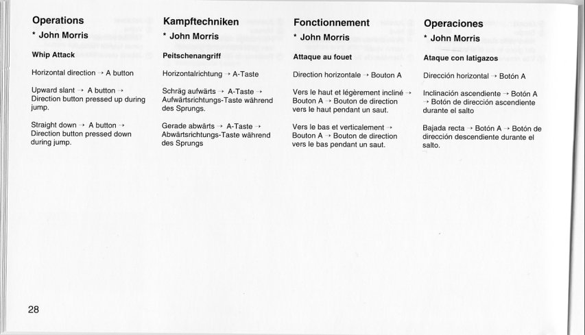 "Like in the Japanese manual, the story does take time to tell of the assassination of Prince of Austria in Sarajevo, in June 1914, leading to WWI and suggesting Bartley did take a role in all this. Like in the Japanese one, the name 'Gwendolyn' is never mentioned, although a 'fiancee' is indeed confirmed to exist. Finally, the European manual (supposedly like the Japanese one) mentions the dark, 'witched' powers of Eric's spear. Also worthy to notice, while the U.S. manual mentions Simon, Trevor and even Christopher, they're nowhere to found in the European manual. I think this is of course because American fans were a lot more acquainted with the series. Dracula's Curse, for example, only came to Europe in October 1992, and by that time no one cared anymore about the NES. European fanbase was small, so mentioning Christopher and Trevor was pointless, only Simon could have been barely recognized. I think this partially explains why we always get an anonymous 'Castlevania' instead of '-Circle of the Moon,' etc."