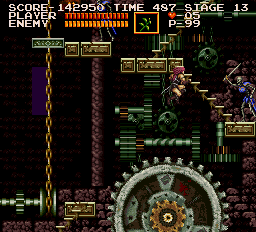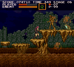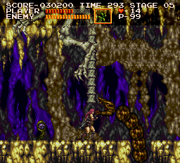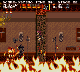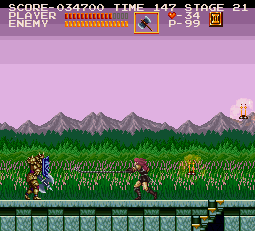 | Limitations: This version of Simon (in either garb) is able to move very swiftly and slyly, and he can swing the whip quickly, repeatedly, too. This iteration has more control over his leaps than any other--each jump can be controlled till its very end, allowing him to duck and dodge while hanging in the air. Favorable hit-detection only helps to amplify the effectiveness of both his speed and his slithery jumping ability. As for offense: While grounded, Simon's confined to swinging it left and right; while airborne, he can thrust the whip diagonally and straight downward. If there's a major problem, it's Simon's trouble handling stairs: He can't jump onto and off of them, and he climbs at a very slow pace; on top of this, his whip and sub-weapons conflict and thus react slowly. The sub-weapons are of the typical sort, but now added to this category is the laurel; using it, Simon can replenish energy over and over again provided he has the hearts to do it. Laurels are rare and difficult to keep for long periods. |