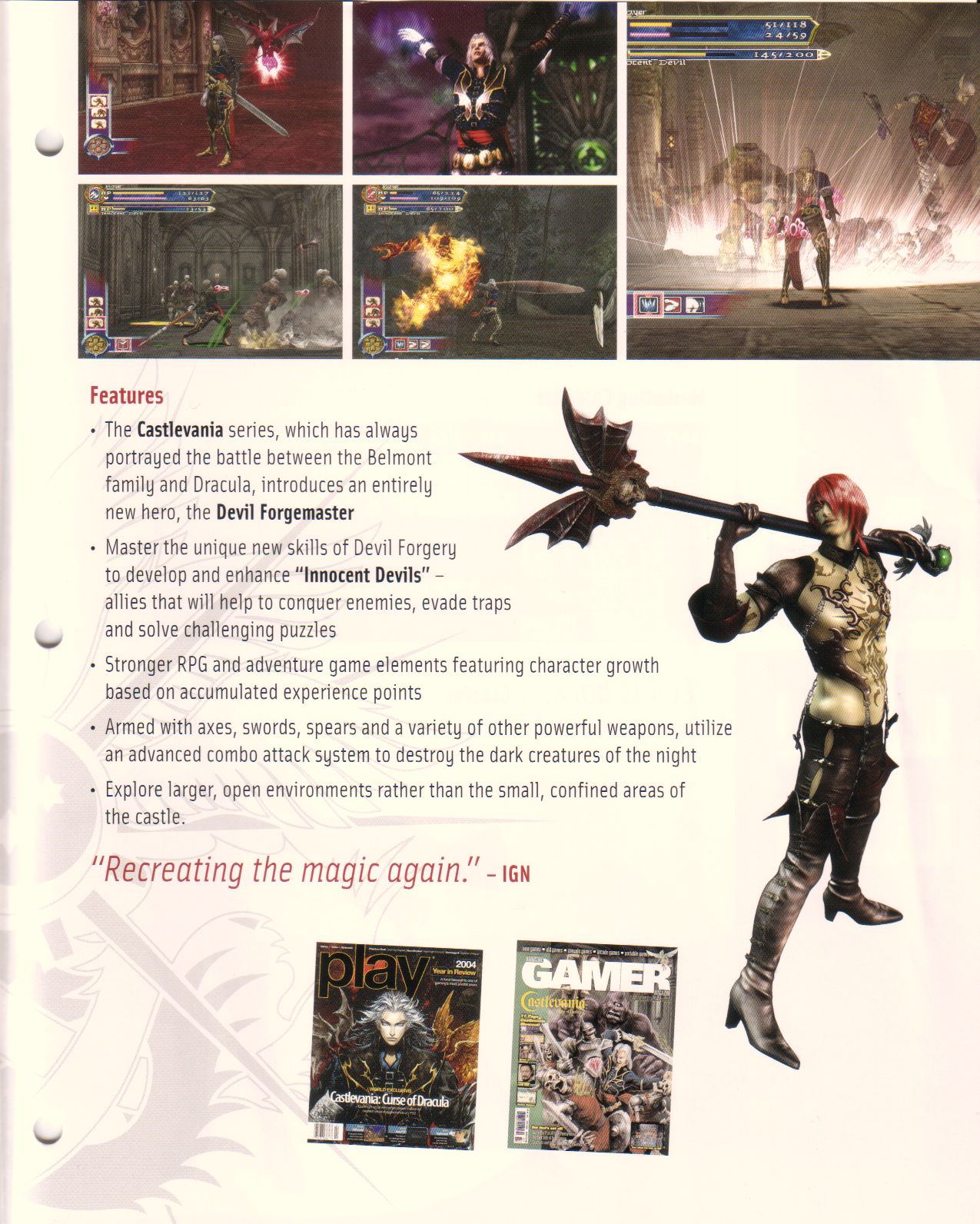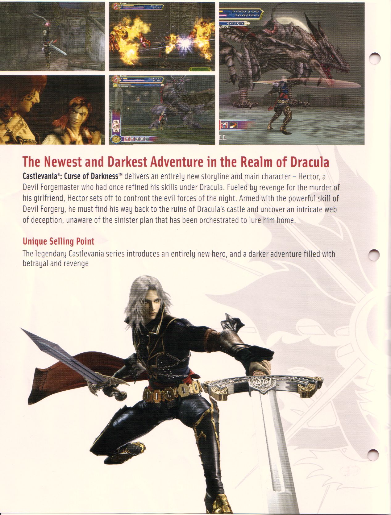 Manual Story Description Prologue 1476, Valachia Belmont and his comrades triumpantly slew Lord Dracula -- a truly glorius victory for all. However, the evil one did not pass from this world in silence. With his final words, Lord Dracula left a demonic curse that enshrouded all of Europe in misery and torment. Ravaged by hideous plague and dire famine, the people's hearts turned black and murderous. The weak were slain without pity, while the land was pillaged and scourged without remorse. Three years have passed since the deat of Lord Dracula -- and the invocation of Dracula's Curse. The Story Take control of the devil forgemaster Hector, who is seeking vengeance for the death of his beloved Rosaly. Falsely accused of witchcraft, she was burned at the stake in a sham trial orchestrated by Isaac, another devil forgemaster still loyal to Dracula's forces. Before you can make Isaac pay for his sins, you must journey across the cursed land of Valachia and make your way to Dracula's Castle. Along the way, hordes of terrifying friends lie in wait, attempting to make each battle your last. It will be a tough battle, but by harnessing the power of the Innocent Devils and weapons that you create along the way, vengeance may finally be yours. |