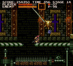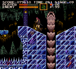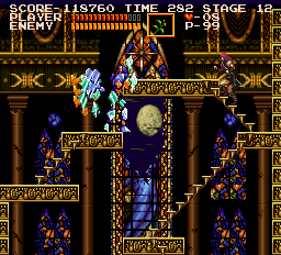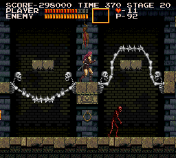This resembles the second stage from Castlevania. To begin, you'll climb upward while having to deal with a lone skeledragon, knights and Medusa Heads. In the next room, it's a journey to the room's top; blood dripping from the eye of a giant statue in the background will become a never-ending supply of blood skeletons, making it hard to climb fast. The next room is your average torture chamber, with three crushing beds of spikes and other spinning spike traps above. The following vertical area contains some bone-throwing skeletons blocking the way; at the top, you'll have to get by an annoying stain-glass ghost. After that, Medusa Heads will be the stage's last attempt to slow you down. If not, the boss that follows will try to finish the job.