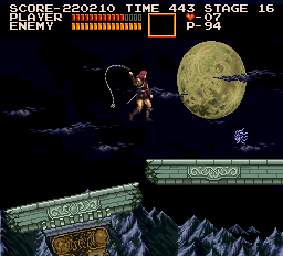First, you'll have to go down a couple of sets of stairs, all guarded by sword skeletons and winged guards. Then you'll have to work your way over a very long collapsing bridge--of course, Medusa Heads will be coming at you. You'll then reenter the castle into the toy room. Most of the bricks you're walking on are little toy chests, some of which open up to reveal killer balloons and toy bats; you'll also have to fight annoying floating dolls and little clowns. Finally, you'll enter a hall filled with mirrors. All of the little mirrors will fall when you walk under them; the round ones rev up and charge at you. Axe knights also await. When you get by the knights, more falling mirrors will be the stage's last obstacle. Three large mirrors occupy the last room, and your reflection in one of them becomes the boss.
