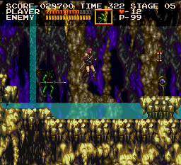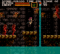 This first half of this stage will see you go mostly downward. After the green slime barriers, there's a split path: The low road has green slime barriers and bats; the top road will have you travel across shallow water while dealing with bats and floating eyes. You'll see green monsters (gargoyles) floating around in the background, which signifies that you'll be dealing with them soon. Either way, you'll make your way onto a raft; the water level will rise frantically after striking the spouting lion's head, swooshing you upward. On the way up, stone platforms will damage the raft, making it smaller each time; you'll have to balance yourself as to not slip into the water. Fishmen will attacking you on either side of the raft, too. Working your way around some platforms onto a second raft will be the last challenge. The ride will soon end, and the boss will emerge from the depths.