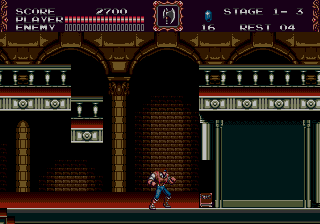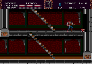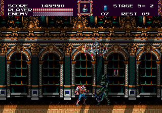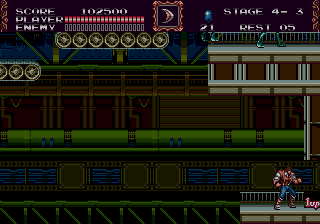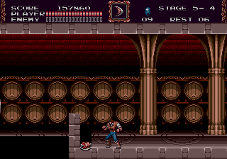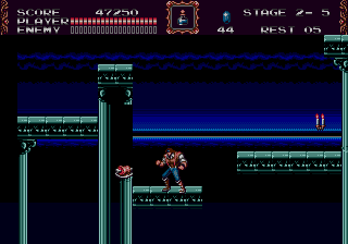 Camouflaged Essence: Since 16-bit games were made during the era of background and foreground layering, Konami sometimes used the latter to hide the most lucrative item-holding candles. By unleashing whip snaps or lance pokes in some areas (behind the small overpasses on Eric's exclusive path on stage 5 - 4, for instance), you may whip a candelabra that'll release a big heart, a high-priced money bag, health replenishment, or an important 1-Up symbol. (Contributed by Danny.)