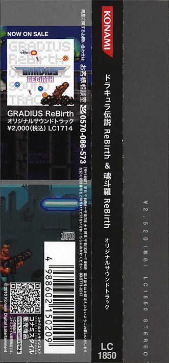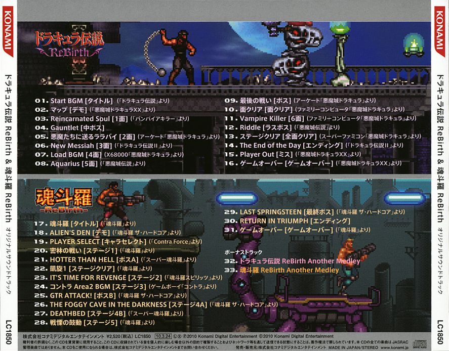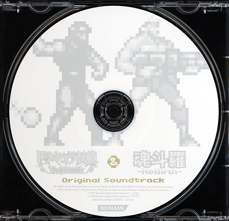Castlevania: The Adventure Rebirth is paired up with fellow digitally released WiiWare title Contra Rebirth for a two-in-one soundtrack release. As of April of 2010, it can only be purchased from Konami's online store. All scans and information were provided by JPCVFAN.