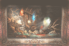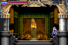 Saving and Hoarding: Dracula's haunt may be a creature of chaos, but the lord of the manor doesn't necessarily like to throw things away--be they the decaying corpses of his demons or the accoutrements of his castle's many save rooms. That is, the save rooms you visit in the adventure-RPG titles appear to be recurring locations, which Aria of Sorrow makes clear. Go to any of the game's save rooms and observe the background, in the bottom-left of which you'll see Alucard's coffin, which was a staple of the save rooms in Symphony of the Night. The "save" rooms in this case are quite literal--perhaps by design. (Contributed by Danny.)