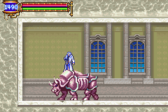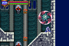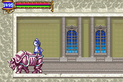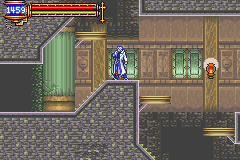 Hunter's Greed: Sometimes what the developers give you just isn't enough. A hero of legend needs more--more terrain to explore and conquer. Take it beyond the mere 100% castle completion (and the 100.3% castle completion possible thanks to other such glitches) with the help of Dracula's unwitting forces. Namely, head to the Dance Hall and to the room depicted in the first screenshot (green X on the third shot); mount the Catoblepas, standing near its head, until its horns start to overlap the left wall, at which point you should move yourself near the beast's tail. As the Catoblepas starts to redirect away from the wall, start holding left on the control pad. This will result in Soma being displaced within the wall and quickly transported, shot upward directly into the Inner Quarters (purple X on the third shot) for increased castle-completion. Note that there is a chance, if not timed correctly, that Soma will instead wind up in an upper Dance Hall room or at the area's teleport room. (Contributed by Amar Youkai.)