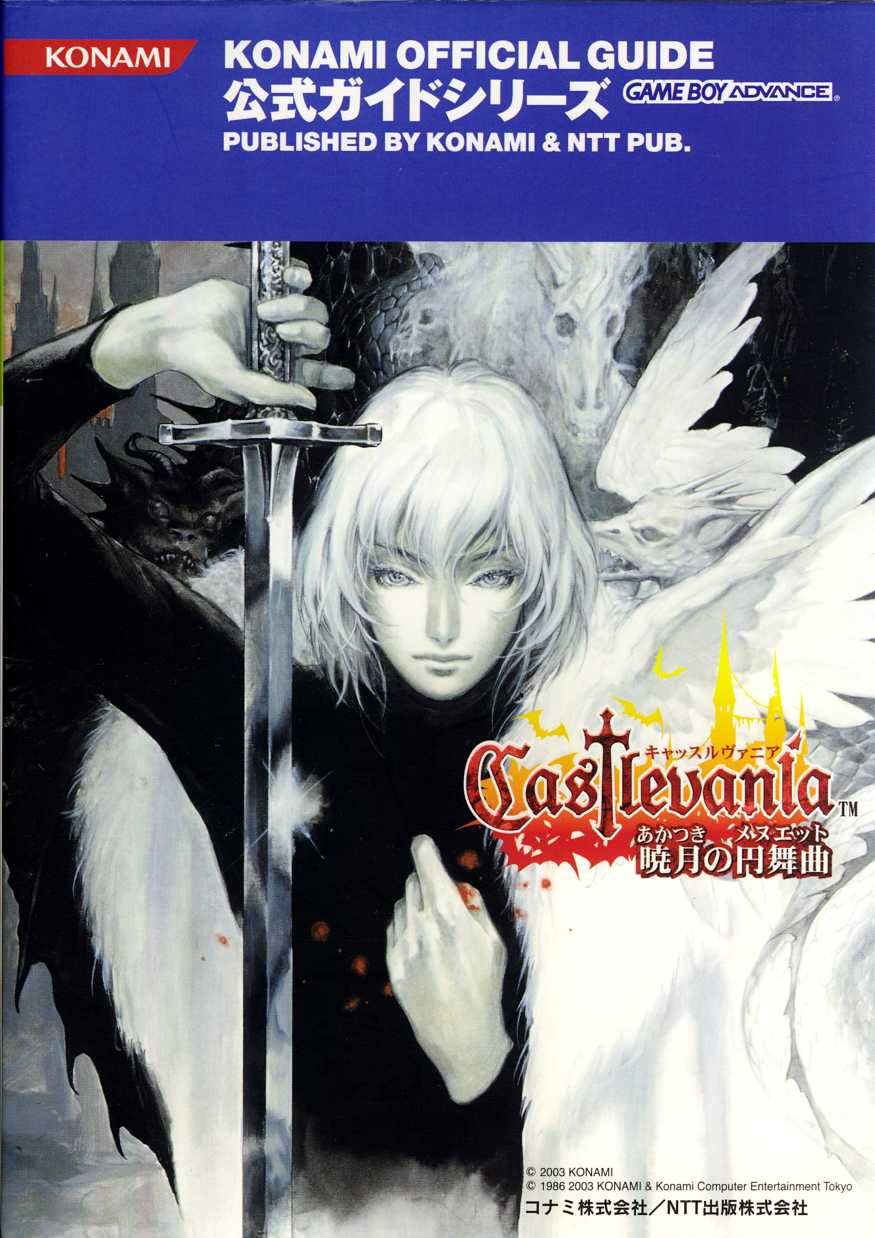 This is the NTT-PUB Official Guide for Castlevania: Akatsuki no Minuet. In addition to maps, item discussion and an enemy list, it features an interview with director Koji Igarashi and his creative staff. All scans were submitted by JPCVFAN.