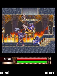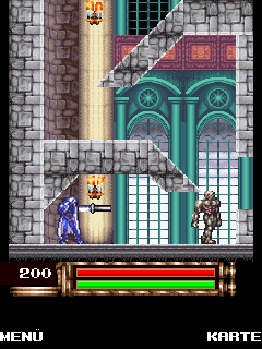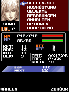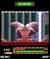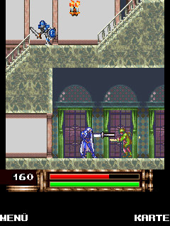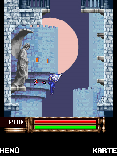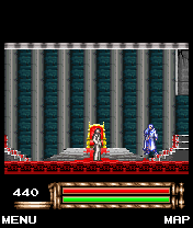 Konami's exploits in the growing cell phone market is becoming a long list of ports of its classic video-game products. Joining the list is Aria of Sorrow, previously a Game Boy Advance exclusive and now proof of Konami's zeal to bring series standouts to the mobile platform (however scattershot the order of release). Aria's is not a direct port and feature's some graphical changes considering cell-phone specifications and limitations; these include a slightly different presentation and overlay, an increase in the screen height (reserved for rooms whose dimensions stretch vertically), condensed menus, loading times, noticeable graphical downgrades, and subdued animation.