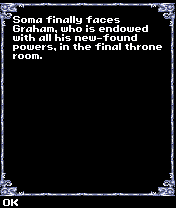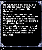 When Graham's chamber is breached, no dialogue scene is witnessed; rather, seen is only a screen explaining the impending battle's circumstances. This version is also bereft of a true ending sequence, as Graham's defeat earns only a similar narration screen before an abrupt "The End" appears as a reward. (These screenshots were contributed by ReyVGM.)