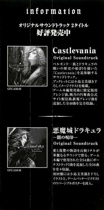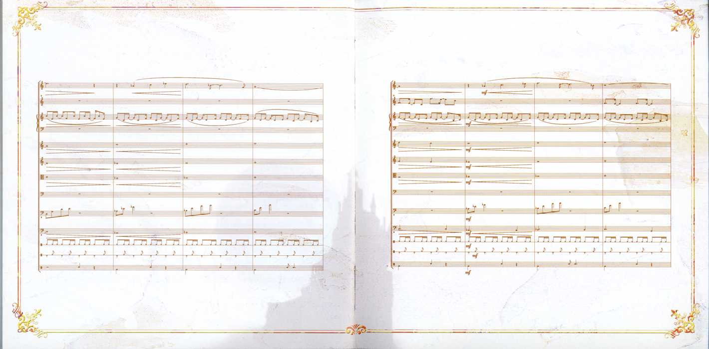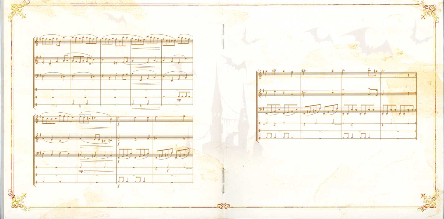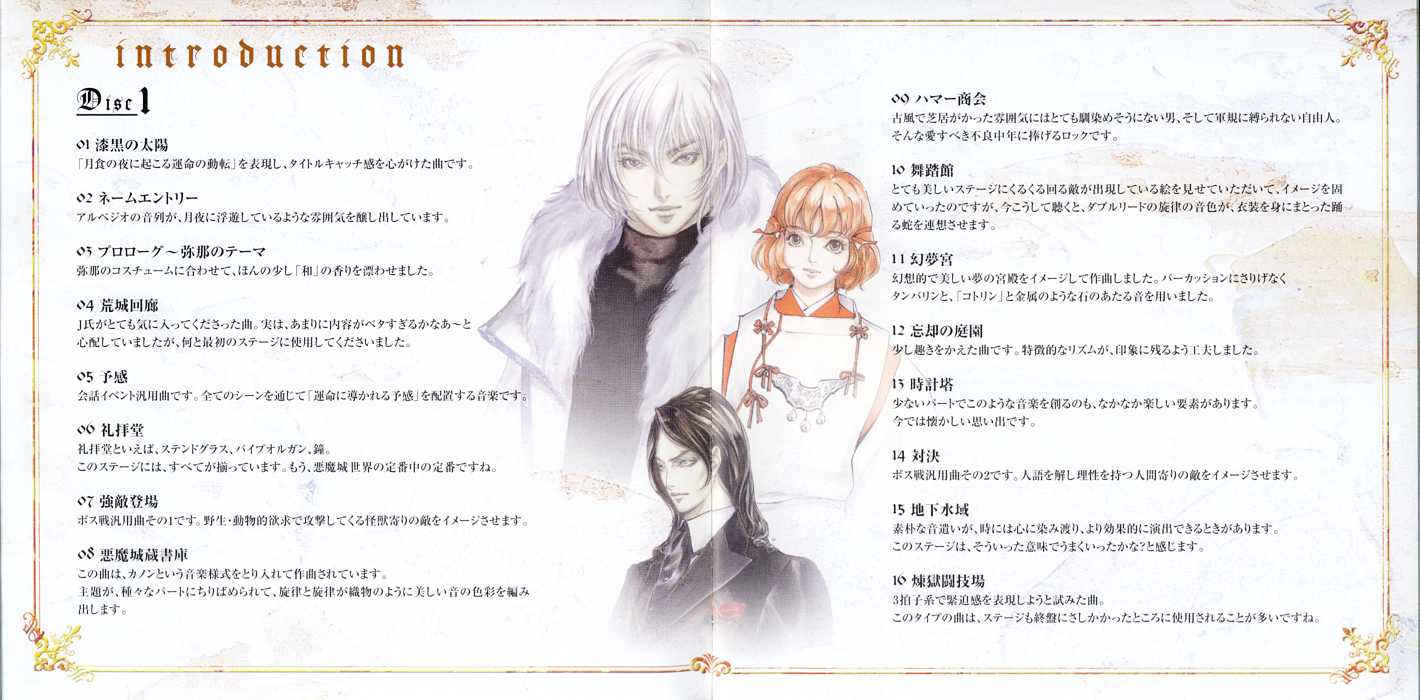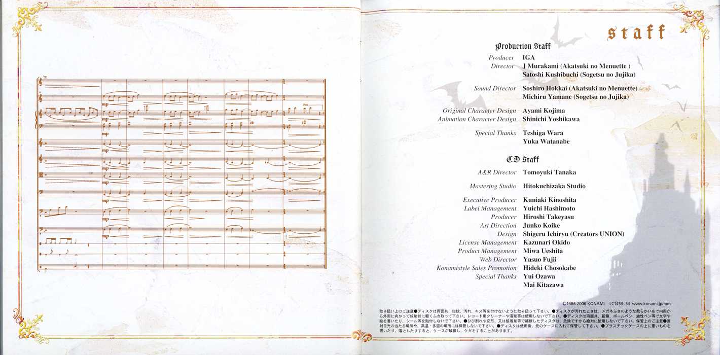As is the case with a few other closely related titles, Atatsuki no Minuet and Sougetsu no Juujika share the same soundtrack. This package comes with a booklet, filled with artwork, commentary and sheet music; two CDs on which the games' tunes are covered; and a pack-in poster--a two-sided fold-out featuring character renders. (All scans were sent in by JPCVFAN.)