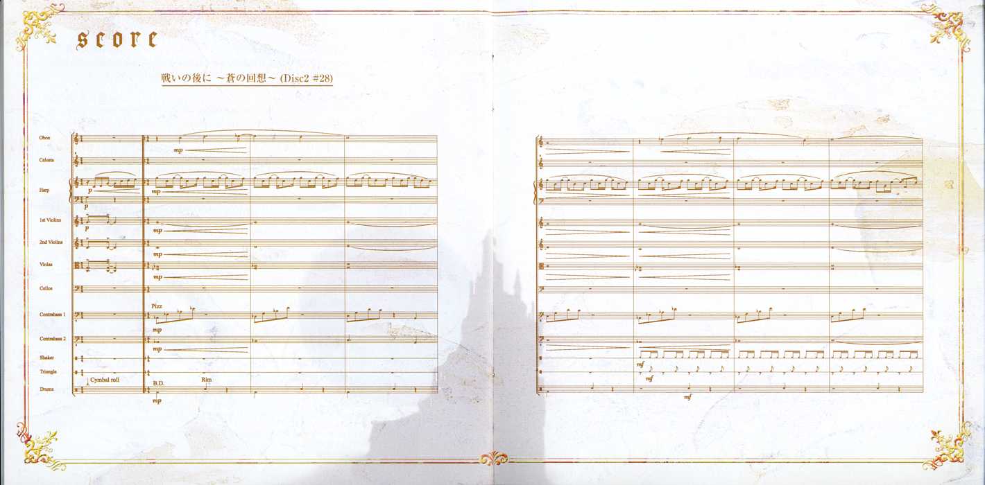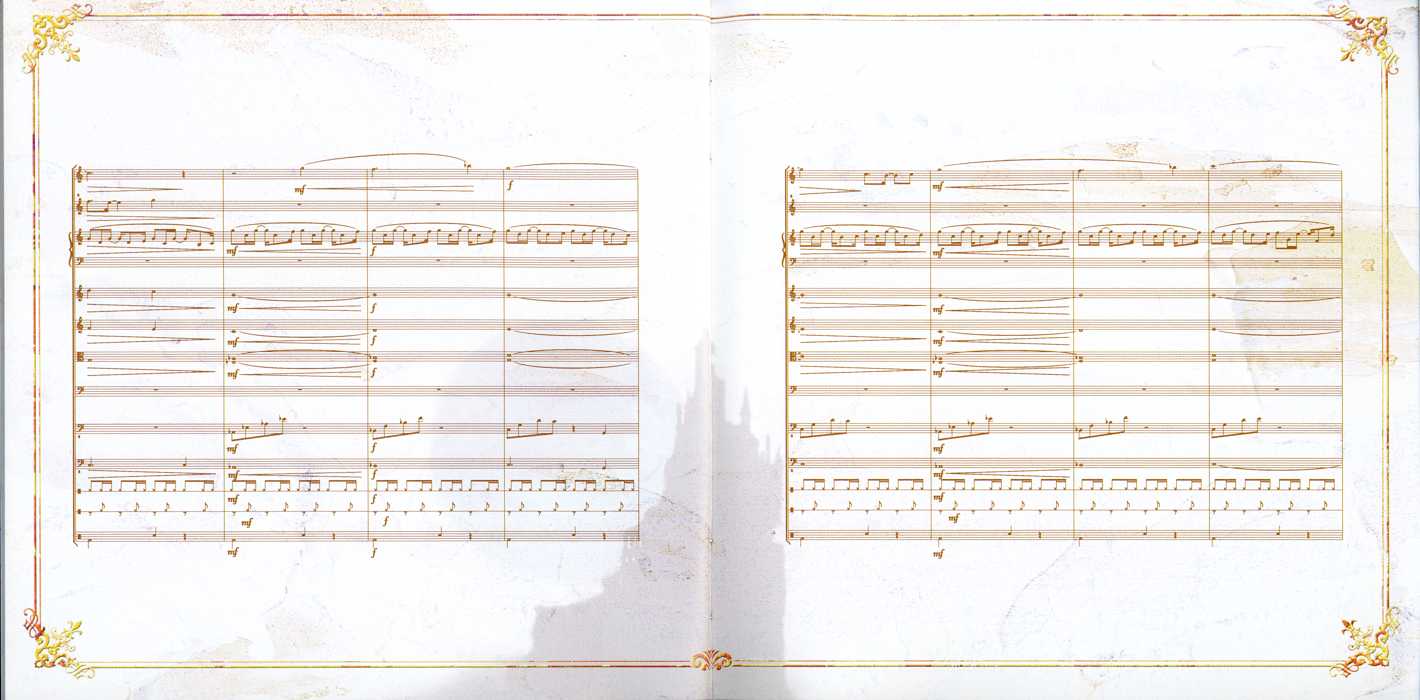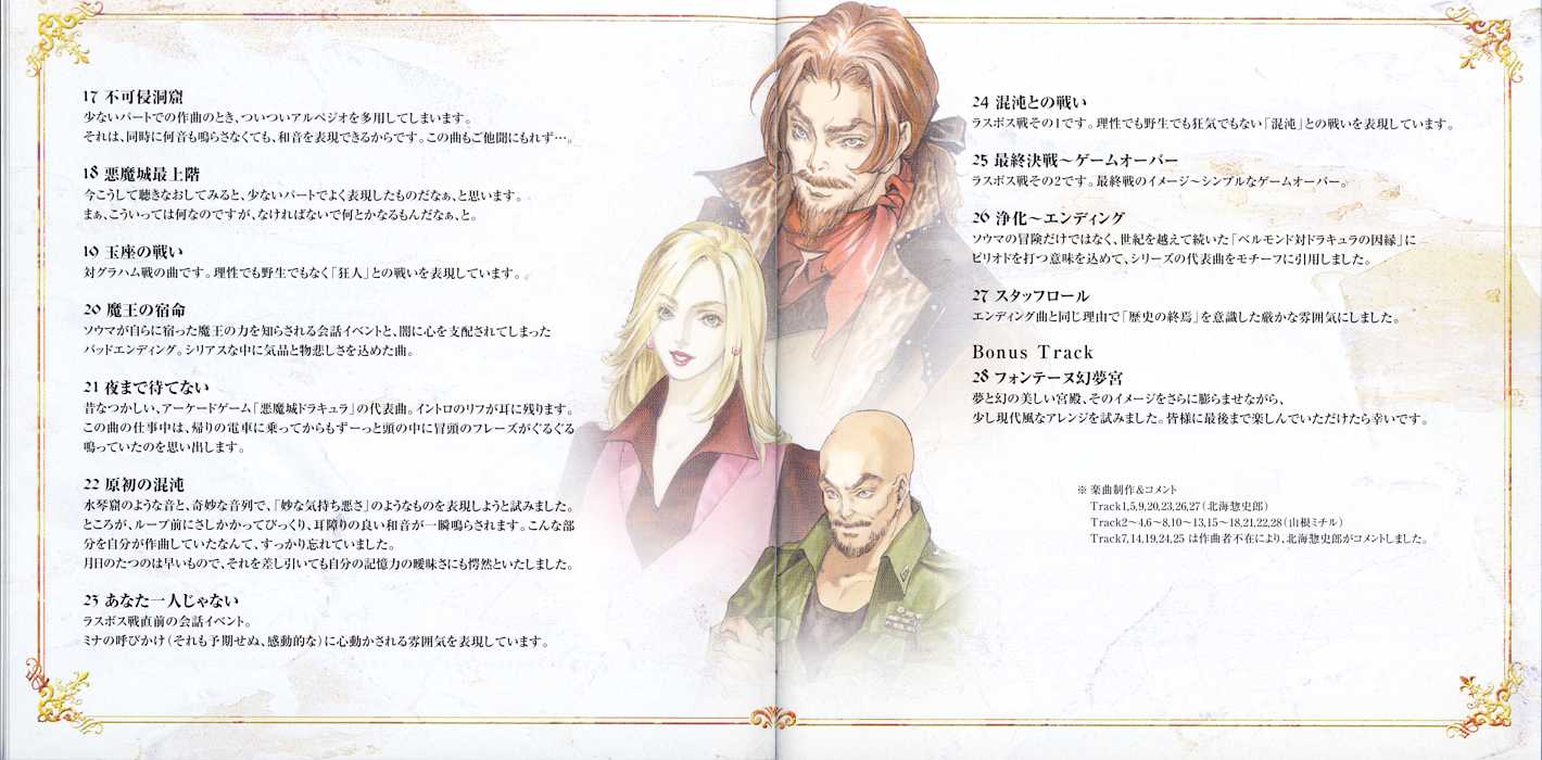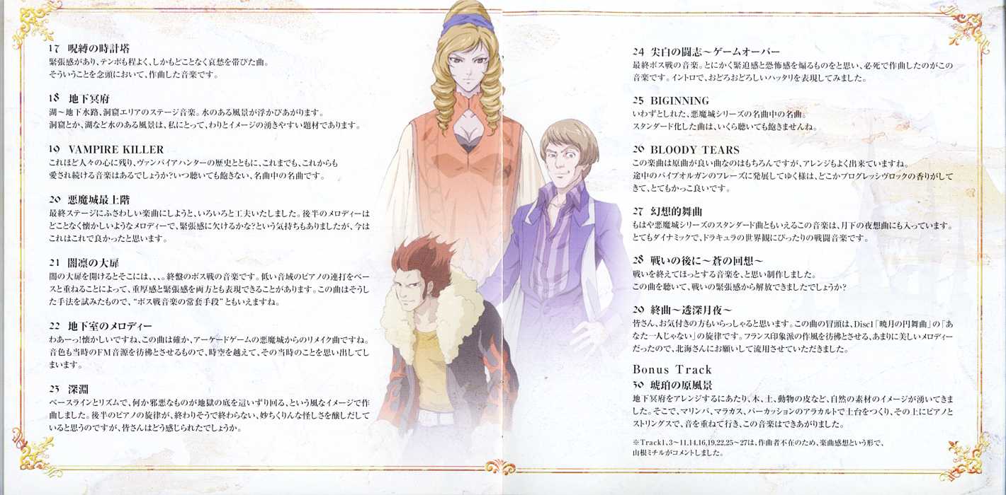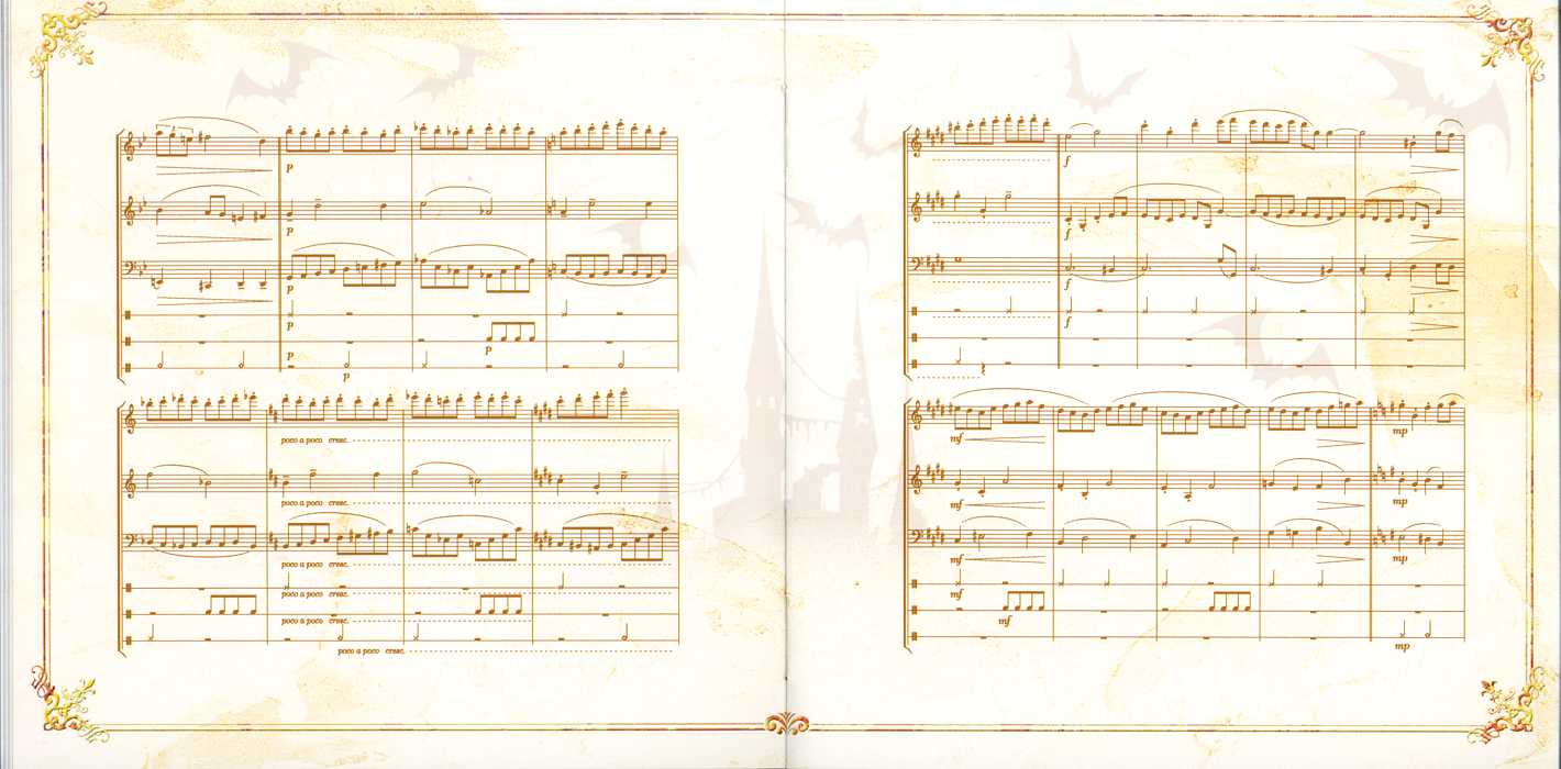 As is the case with a few other closely related titles, Atatsuki no Minuet and Sougetsu no Juujika share the same soundtrack. This package comes with a booklet, filled with artwork, commentary and sheet music; two CDs on which the games' tunes are covered; and a pack-in poster--a two-sided fold-out featuring character renders. (All scans were sent in by JPCVFAN.)