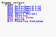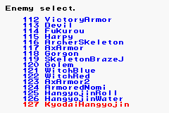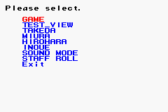 After applying the code, use a soft reset to gain entry into the debug menu; it has eight available options plus "Exit," which exits the debug mode and starts the game as normal. Not including "Sound Mode" and "Staff Roll," which link directly to the same sound test and credits sequence already accessible, I'll give a brief explanation of each option with screenshots where applicable.