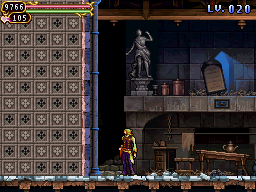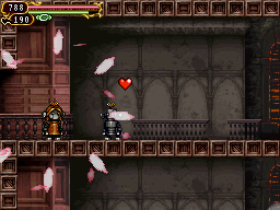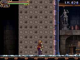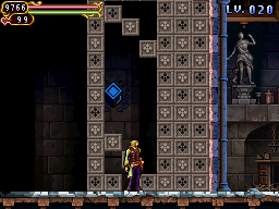 Taking Tetris Literally: Early in her travels, Shanoa will explore the Monastery only to sense the Cubus Glyph, which is trapped beyond an unbreachable wall and obscured by a never-ceasing falling-block puzzle; she'll later absorb the Glyph with the help of advanced weaponry, without ever touching ground in this "blocked"-off room portion. To the more-adventurous player's rescue comes the unlockable Albus, whose warp ability allows him to breach the wall and witness the block-falling madness up close and as a willing participant. "Is it a glitch, or did the designers intend for Albus to have this level of access?" you ask. Whatever the case, you can now walk upon ground that in any sense feels forbidden. (Contributed by Ricardo Granda.)