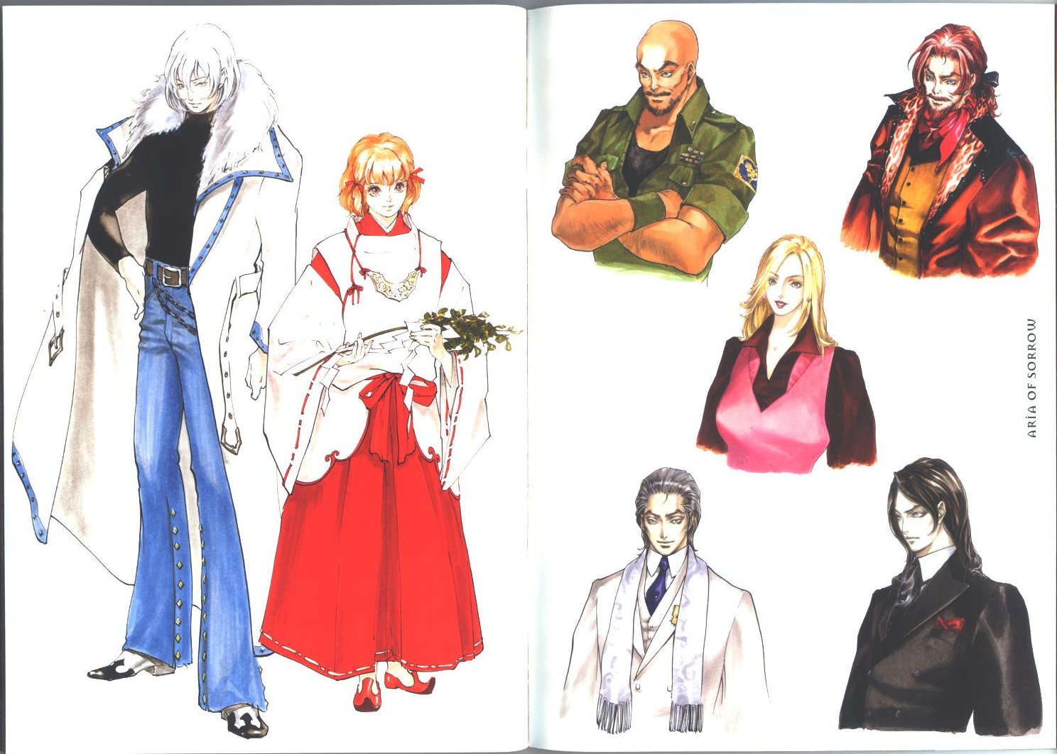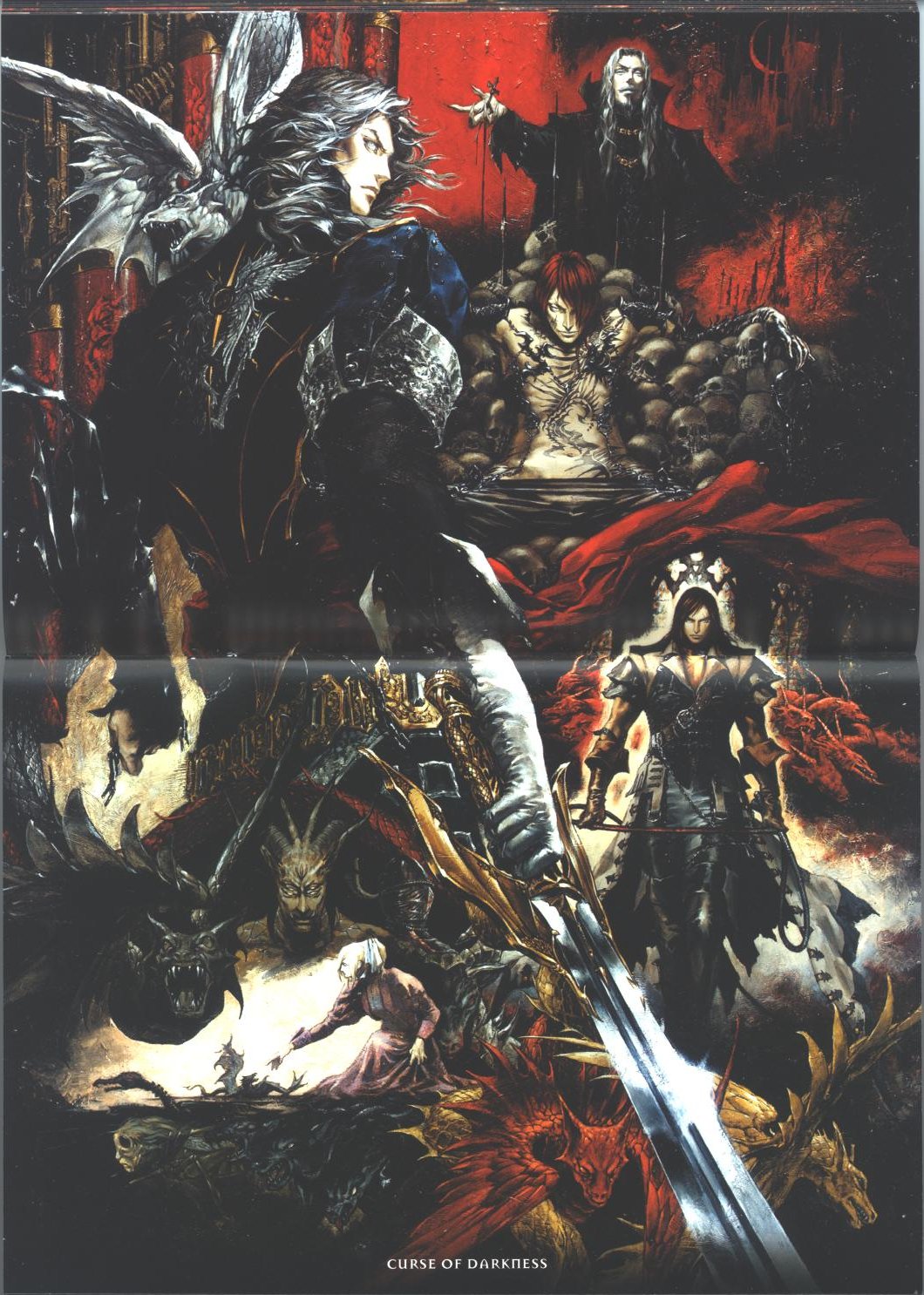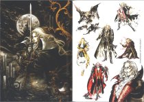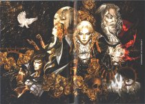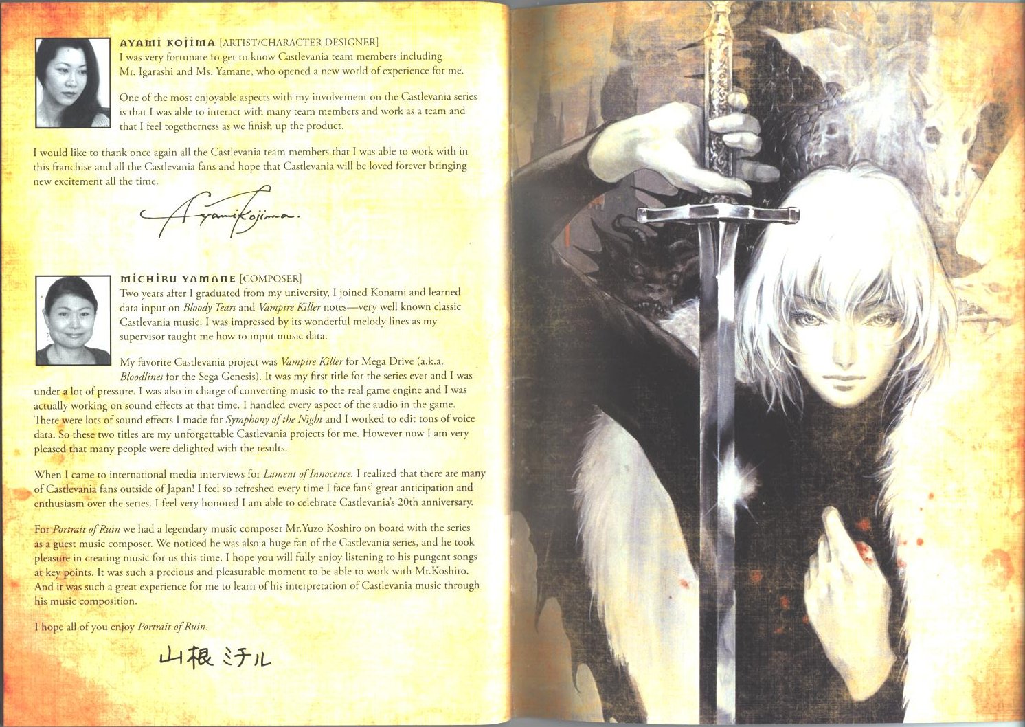 Like the music CD, the forty-four page art book covers all games ranging from Castlevania to Portrait of Ruin. Included, too, are profiles and thoughts of the Big 3: Producer and director Koji Igarashi, music and sound composer Michiru Yamane, and artist/character designer Ayami Kojima. Since the files are so large, they are listed on this page as thumbnails (sans covers); to see a full image, click on any thumbnail.