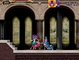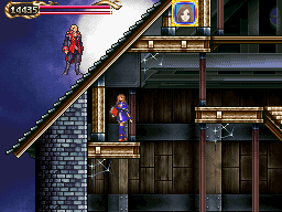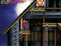 Out and About: It seems that Symphony of the Night's out-of-castle glitches were all the rage with hackers and exploration-hungry scamps alike. This practice continued with the future titles created using its mold. It continues here thanks to Charlotte and Jonathan's toad morph ability, which must first be secured. The power in your inventory, head to the Great Stairway and to a top room where you can see outside the castle and specifically a sloped roof (left side). Put Jonathan in the lead and on a platform whose bottom is parallel to the roof's tip, press up against the wall, have Charlotte use the Toad Morph (by hitting "R"), and then have Jonathan use the Rocket Slash sub-weapon; this will result in a rather bouncy hero now free to roam the castle boundaries. This will work in any area where there's a thin sloped wall. To thereafter return to the castle, use a Magical Ticket. Be warned, though, that suspending and returning to the game while "out and about" will result in the game freezing. (This glitch, contributed by Amar Youkai, is not present in the European version.)