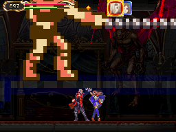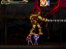 The Greatest Sprites: Sometimes you just can't replace the classics. Jonathan and Charlotte's successful trek through the Nest of Evil will net them the "Greatest Five" Dual Crush, which summons forth five legendary heroes (Richter, Leon, Trevor, Juste and Simon) whose combined might deals to enemies a devastating blow. Though heroes have been reimagined in animating this incantation, the developers threw in a bonus for longtime fans: The two NES-attached heroes, Simon and Trevor, will on occasion appear in their classic 8-bit forms. (Contributed by Amar Youkai.)