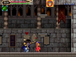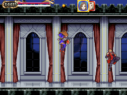 Tiger Knee: Jonathan is sure to procure the Knee Strike sub-weapon, which will allow him to dash at enemies with a vicious knee to the nether-regions. Why not conjure up and tap into the athleticism of the past Richter Belmont and take this attack to the next level? Do this by first equipping the sub-weapon before placing Charlotte as the lead character; have Charlotte jump and before double-jumping hit the "R" button to activate the partner-assist attack. That is, Jonathan will dash forward, his knee outstretched, and attempt to emulate Charlotte's movement by ascending into the air and off the screen. He'll disappear offscreen but automatically return to her side. (Contributed by Amar Youkai.)