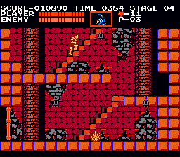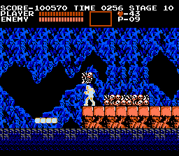 Top Hunter: There's one thing for which future castle-crawling heroes should be grateful: It was Simon (or "Old Man Belmont," as they call him) who practically invented the "out-of-castle" glitch years before it would gain recognition. Put Simon's unintended skill to the test on the last leg of Stage 4; approach the cavern's first skeledragon and influence its attack trajectory so that one of its fireballs hits Simon at the peak of his jump. Success will have been earned if Simon is sent hurtling upward and through the ceiling, on which he can walk. There should be no fear of getting stuck, as there exists one gap through which he can drop. (Contributed by Amar Youkai.)