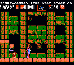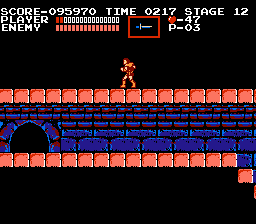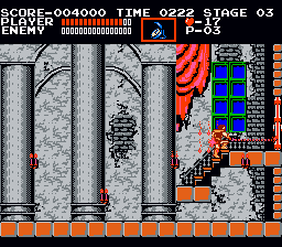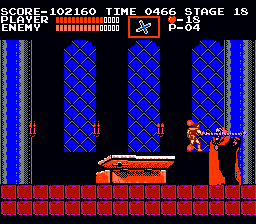 Crtitical Hits: Even people who have been playing Castlevania for decades may not realize that there's a way to inflict critical damage upon bosses or even one-shot them. These critical hits occur not as consequence of an intended mechanic but instead a programming oversight that allows for scenarios wherein bosses take excessive damage when struck by the whip or a sub-weapon under very specific conditions and with particular timing. So keep in mind that they're excessively difficult to pull off once no less with any regularity. For the Phantom Bat, it's a matter of striking it the exact moment (or "within a two-frame window," to use the speedrunner lingo) that it collides with you while you're facing away from it. The most reliable method involves some manipulation on the player's part: You have to (a) position Simon so that he's standing on the second and third steps, (b) wait for the bat to detach itself from the ceiling, (c) react by swiftly moving up to the third and fourth steps, and (d) then swing the whip in the moment after the bat swoops toward you--about a split second before it makes contact. Pull it off successfully and the bat will die instantly.