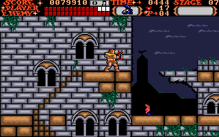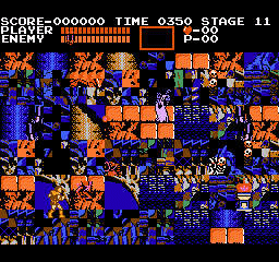 Come to Glitchville, Leave Early: Your trek through the first leg of Level 4 (Stage 10) ends when you come in contact with a top platform and its stairway whose very proximity prompts you to the next part of the level (it always seemed odd that you weren't able to actually climb this staircase). Maybe in doing this the developers were hiding something about faulty coding, at which Belmontvlad's submitted glitch hints. To mess around with this odd mechanic, have Simon reach the top platform as knocked up to it through contact with one of the frequently appearing vampire bats. If done correctly, the scene will shift to the correct area, the courtyard, then immediately flash back to the screen previous, which is now glitched to all hell and without sanctuary for our poor hero, who will immediately fall to his death. The good news is that you'll continue right from courtyard area rather than back at level's start.