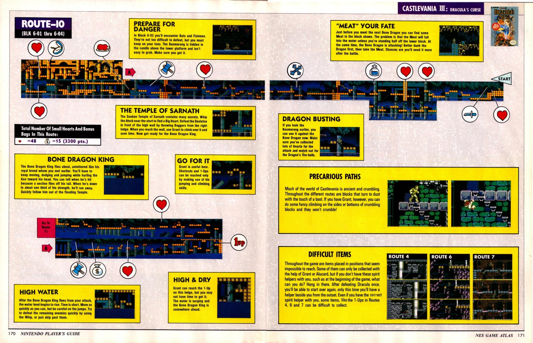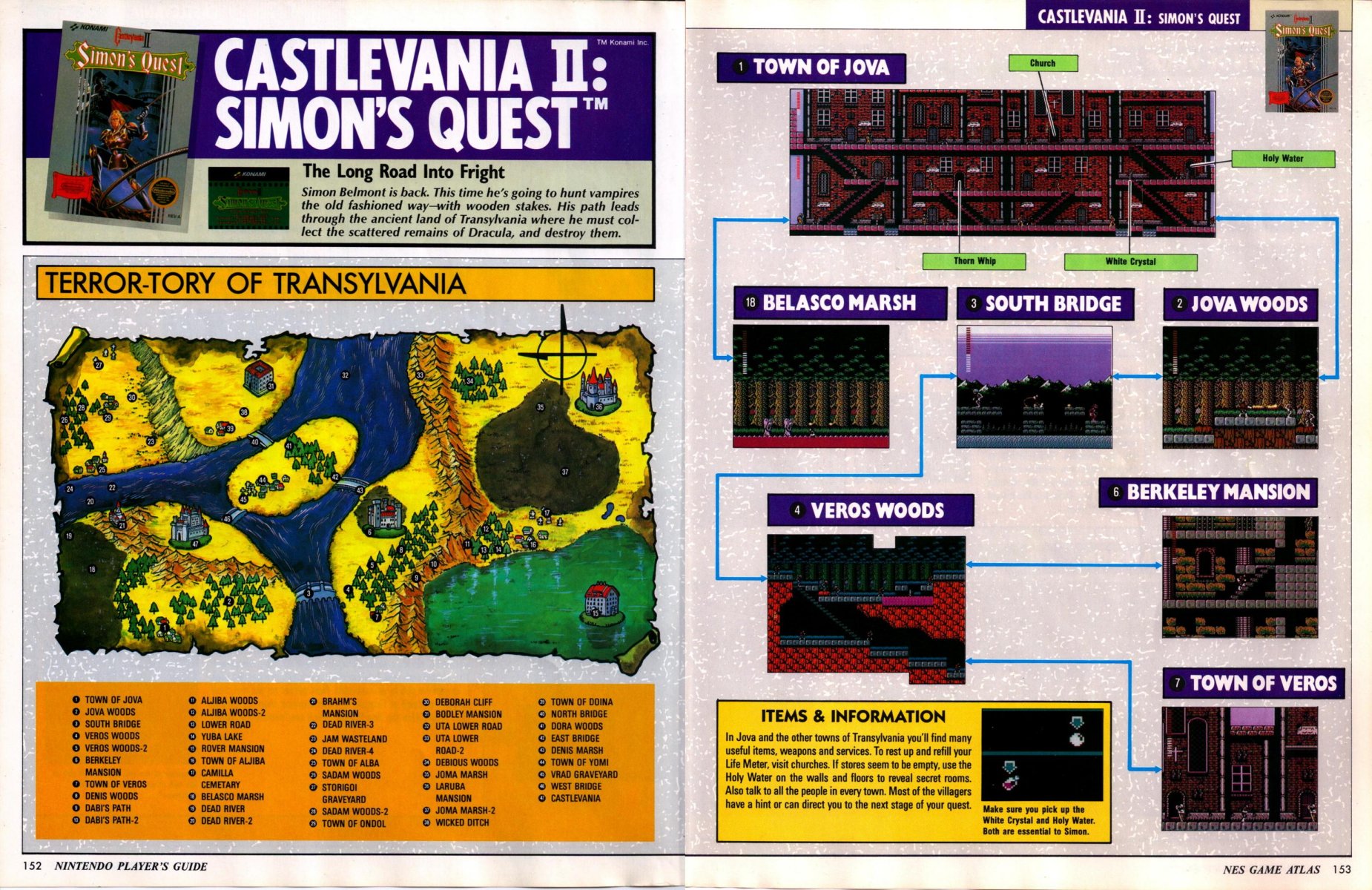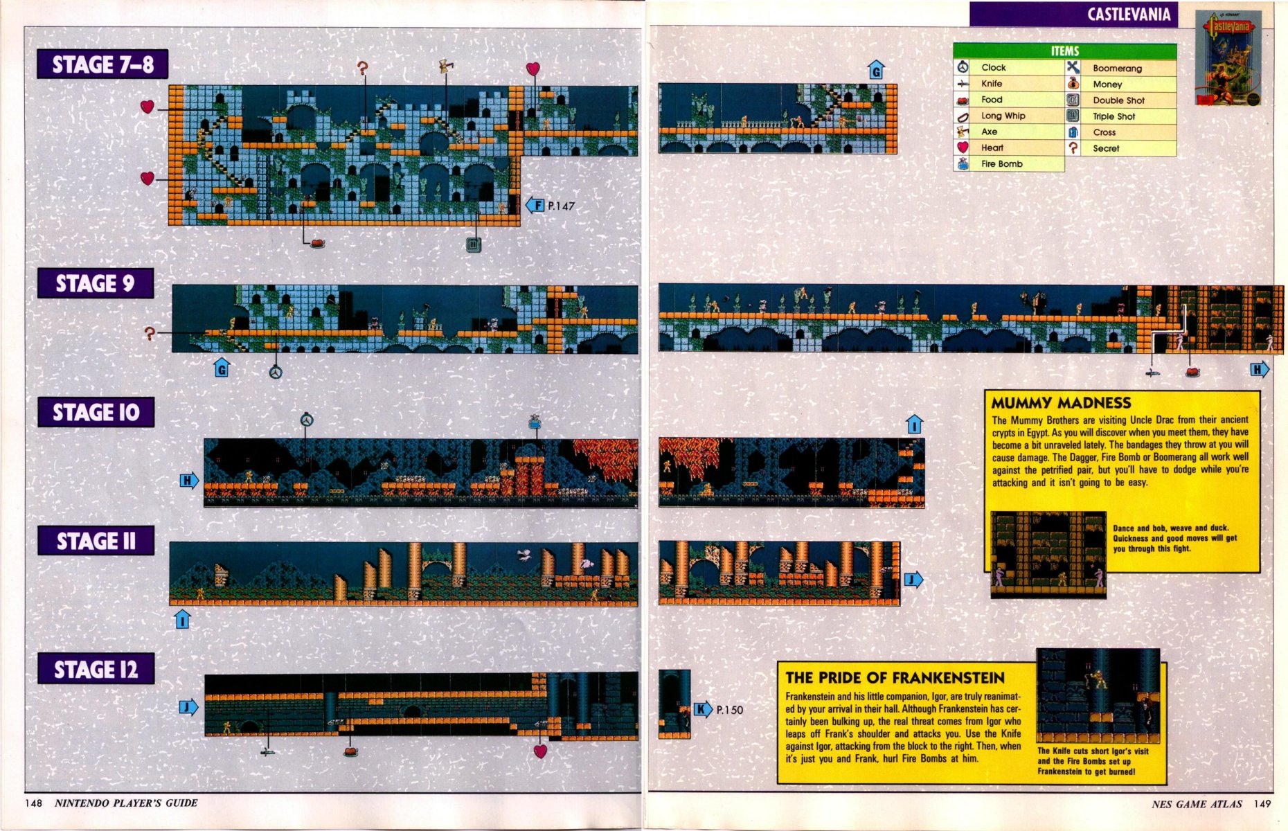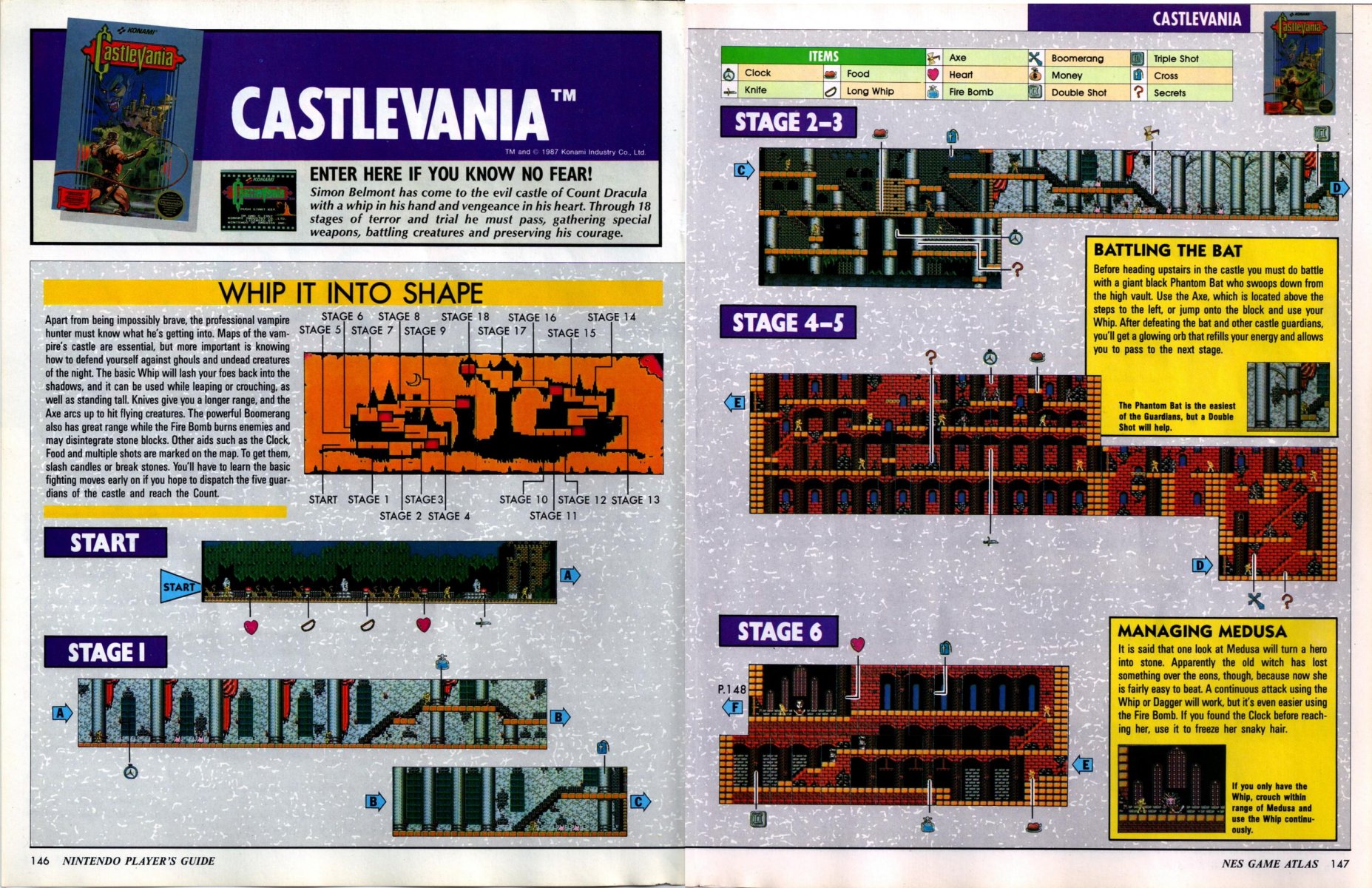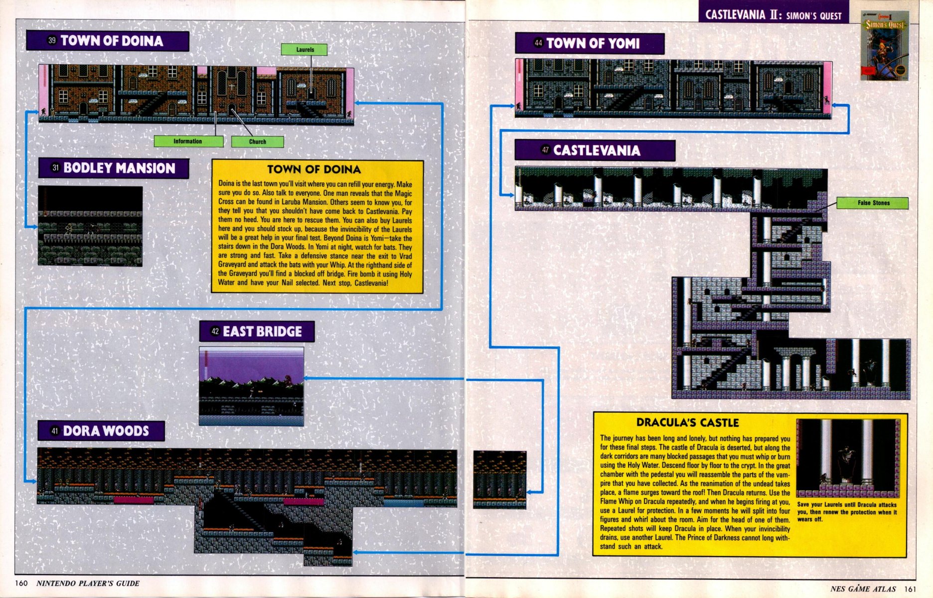 The NES Game Atlas, released in 1991, is the spiritual successor to 1987's Official Nintendo Player's Guide. The NES' game library now much larger, the Game Atlas covers whole series, including Super Mario Bros., Mega Man, The Legend of Zelda, Ninja Gaiden, and, of course, Castlevania. The three NES classics--Castlevania, Simon's Quest and Dracula's Curse--are provided stage/area maps, item locations, and boss strategies. (All images have been contributed by Greg and Kira MorningStar.)