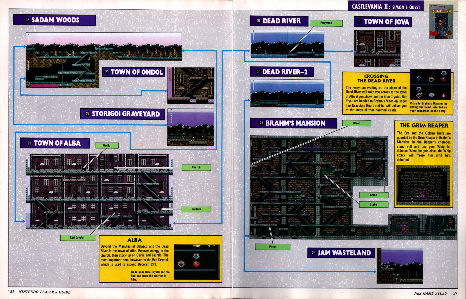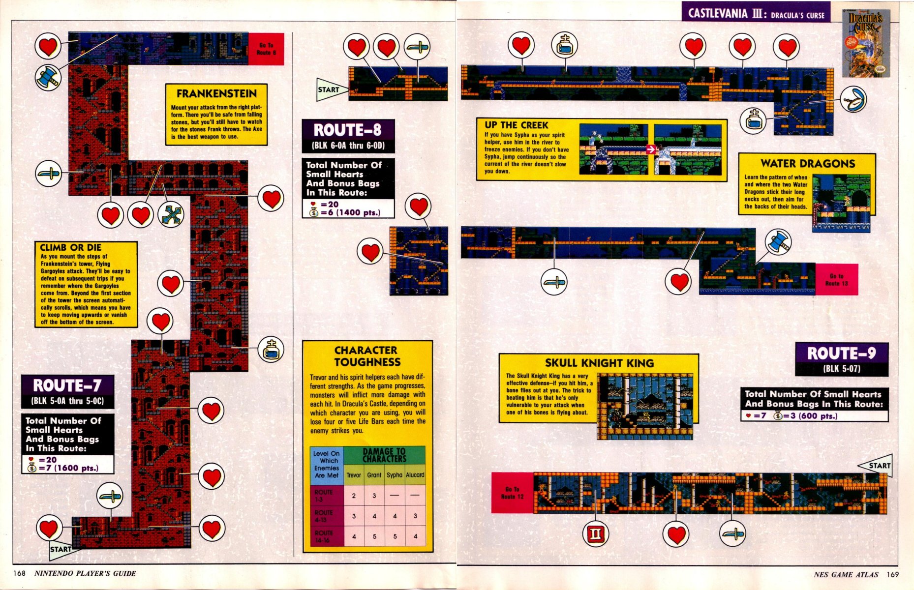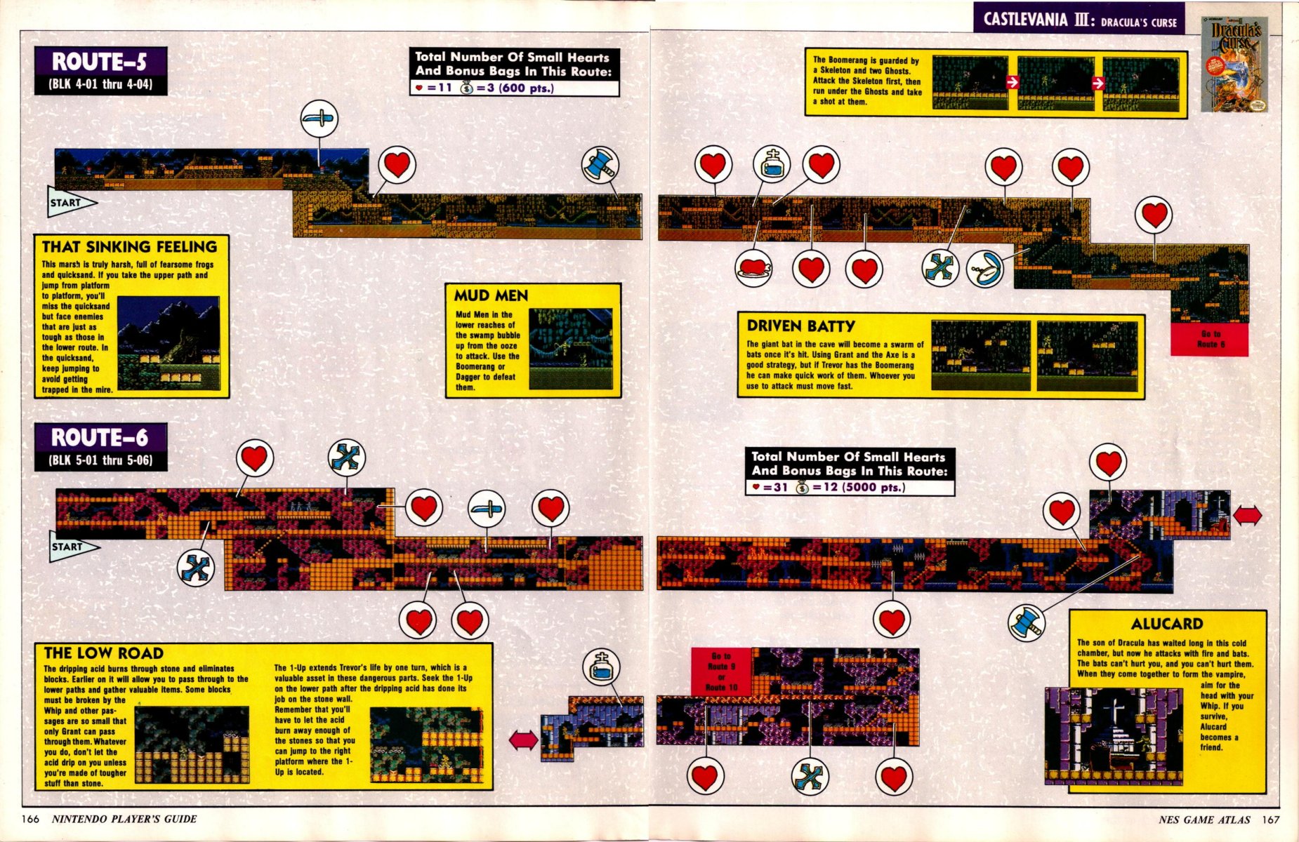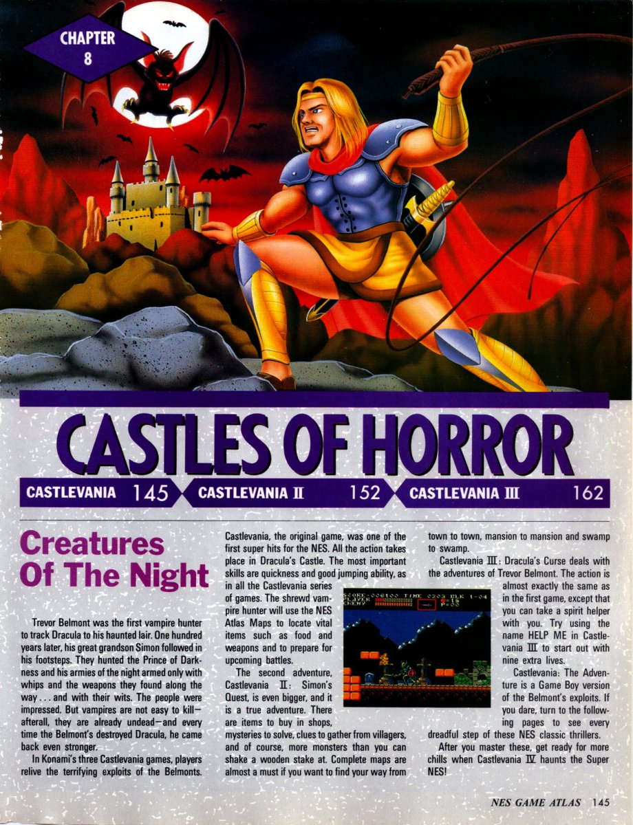 The NES Game Atlas, released in 1991, is the spiritual successor to 1987's Official Nintendo Player's Guide. The NES' game library now much larger, the Game Atlas covers whole series, including Super Mario Bros., Mega Man, The Legend of Zelda, Ninja Gaiden, and, of course, Castlevania. The three NES classics--Castlevania, Simon's Quest and Dracula's Curse--are provided stage/area maps, item locations, and boss strategies. (All images have been contributed by Greg and Kira MorningStar.)