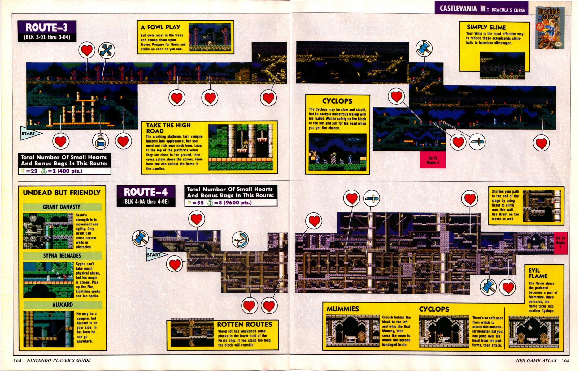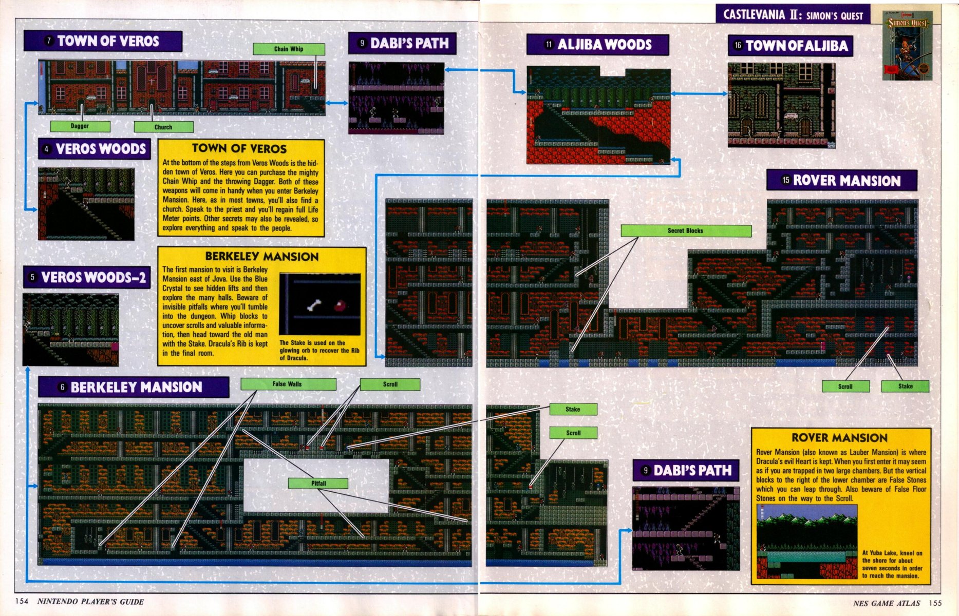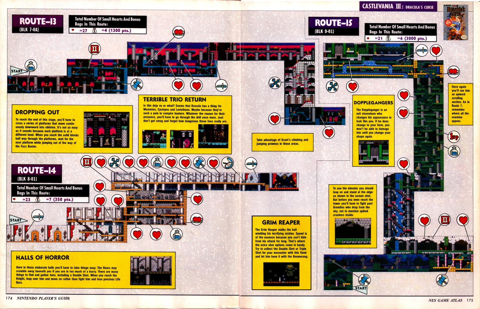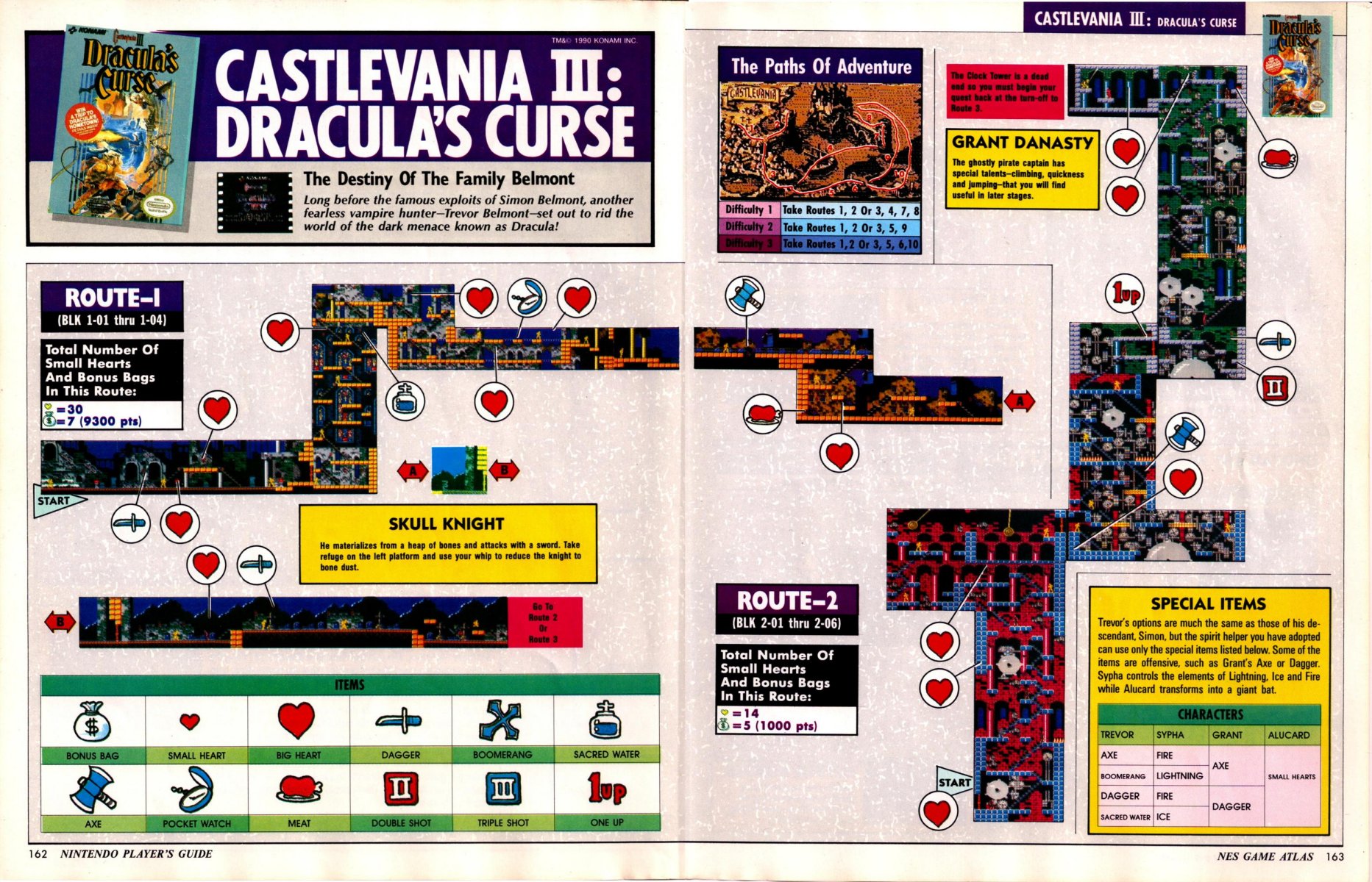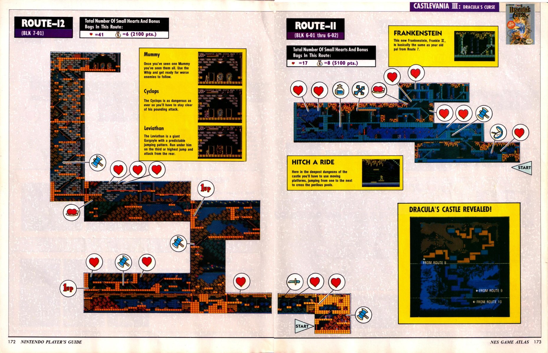 The NES Game Atlas, released in 1991, is the spiritual successor to 1987's Official Nintendo Player's Guide. The NES' game library now much larger, the Game Atlas covers whole series, including Super Mario Bros., Mega Man, The Legend of Zelda, Ninja Gaiden, and, of course, Castlevania. The three NES classics--Castlevania, Simon's Quest and Dracula's Curse--are provided stage/area maps, item locations, and boss strategies. (All images have been contributed by Greg and Kira MorningStar.)