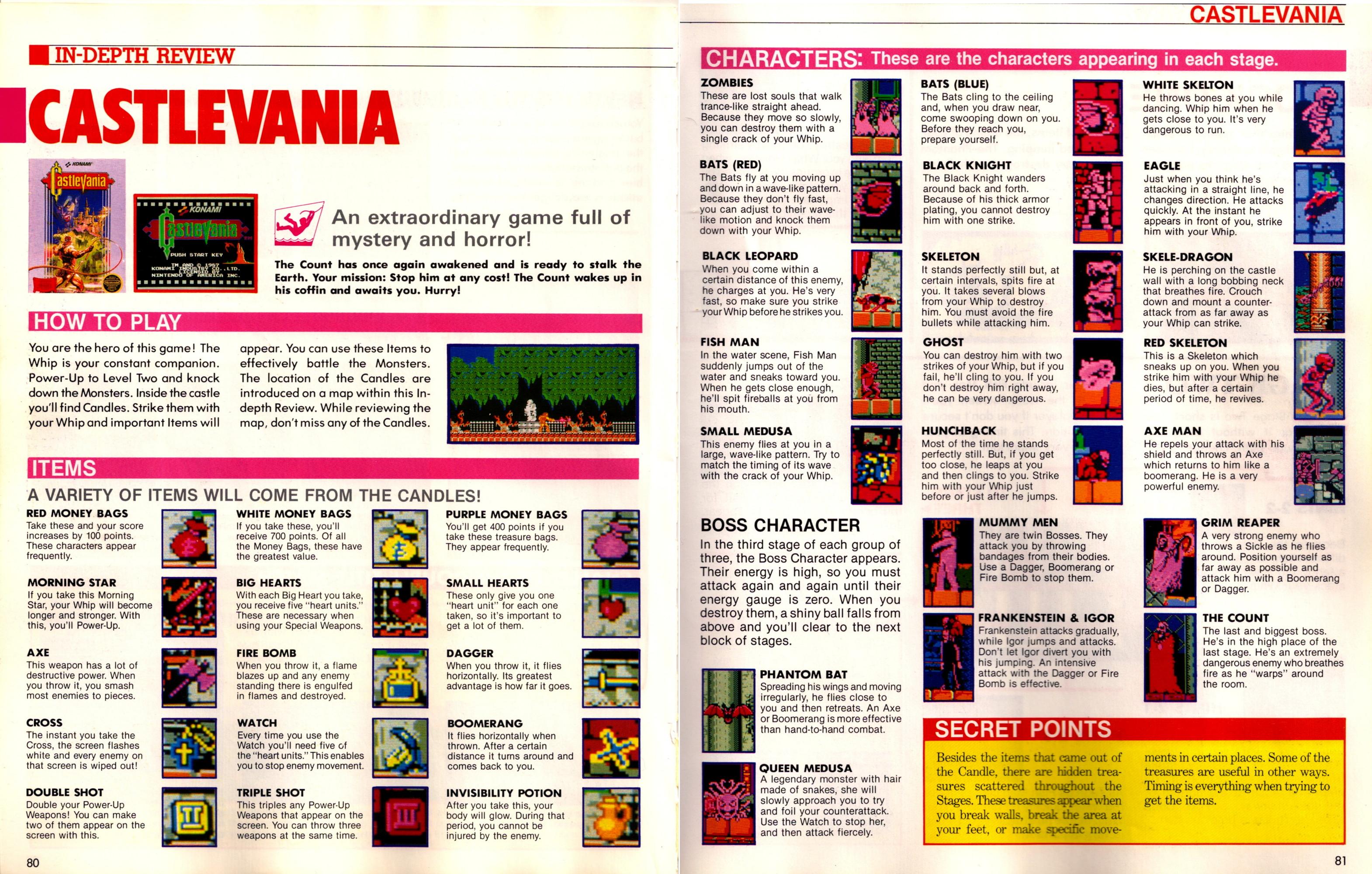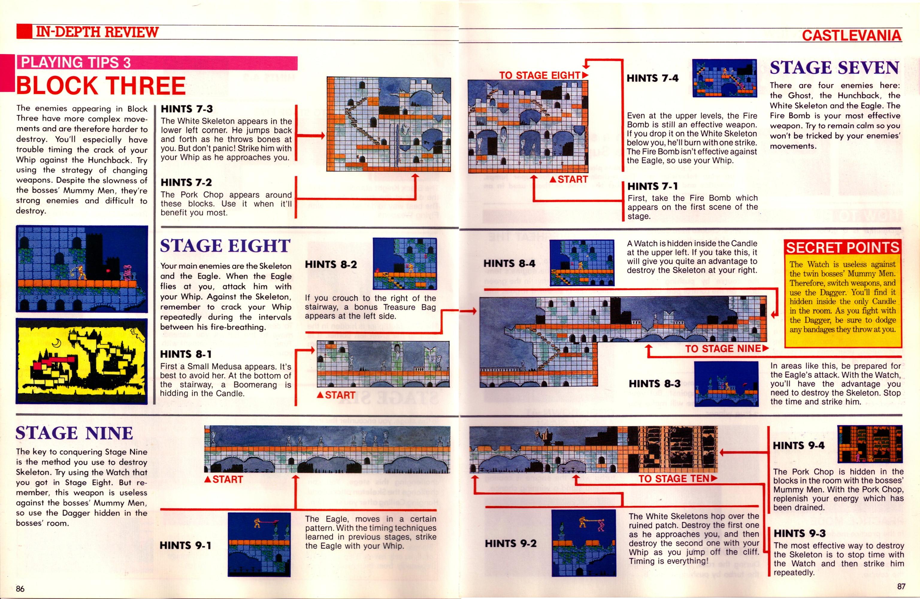 The Official Nintendo Player's Guide, released in 1987, provides overviews and detailed maps for what were the NES' early classic titles. Included is four pages of coverage for Castlevania, which was released in North America that same year. (All images have been contributed by MorningStar.)
